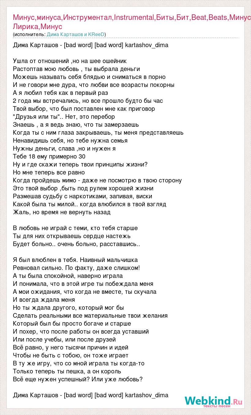Дима Карташов - [bad word] [bad word] kartashov_dima Ушла от отношений ,но на шее ошейник Растоптав мою любовь , ты выбрала деньги Можешь называть себя блядью и сниматься в порно И не говори мне дура, что любви все возрасты покорны А я любил тебя как в первый раз 2 года мы встречались, но все прошло будто бы час Твой выбор, что был поставлен мне как приговор "Друзья или ты".. Нет, это перебор Знаешь , а я ведь знаю, что ты замерзаешь Когда ты с ним глаза закрываешь, ты меня представляешь Ненавидишь себя, но тебе нужна семья Нужны деньги, слава ,но и нужен я Тебе 18 ему примерно 30 Ну и где скажи теперь твои принципы жизни? Но мне теперь все равно Когда пройдешь мимо - даже не посмотрю в твою сторону Это твой выбор ,быть под рулем хорошей жизни Размешав судьбу с наркотиками, запивая, виски Какой была ты милой.. когда влюбился в твой взгляд Жаль, но время не вернуть назад В любовь не играй с теми, кто тебя старше Ты для них открываешь сердце настежь Будет больно.. очень больно, расставшись.. Я был влюблен в тебя. Наивный мальчишка Ревновал сильно. По факту, даже слишком! А ты была спокойной, наверно играла И понимала, что в этой игре ты побеждала меня А мои ожидания, что когда не вместе, ты скучала И всегда ждала меня Но ты ждала другого, который мог бы Сделать реальными все материальные твои желания Который был бы просто богаче и старше И похер, что после работы он всегда уставший Или после учебы, или после друзей Всё равно, у него тысячи причин и идей Чтобы не быть с тобою, он тоже играет В ту же игру, что со мной играла ты когда-то Только теперь ты пешка, а он король Всё еще нужен успешный? Или уже любовь? Дима Карташов - [bad word] [bad word] kartashov_dima