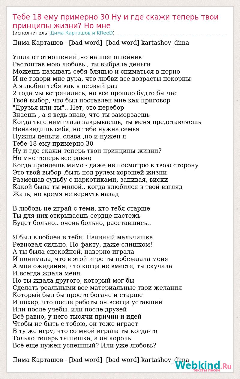 Главная→Исполнители→Дима Карташов и KReeD→Тебе 18 ему примерно 30 Ну и где скажи теперь твои принципы жизни? Но мне