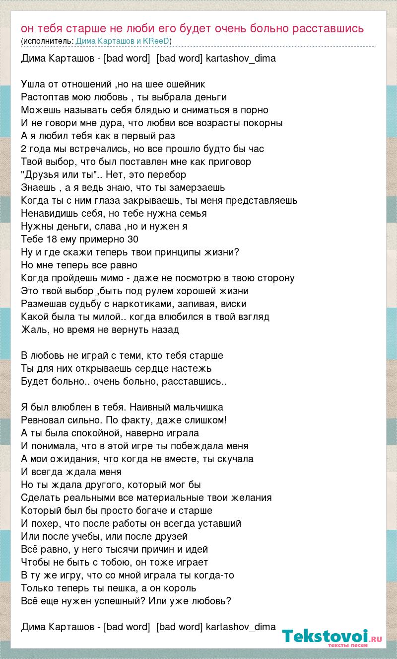 Дима Карташов - [bad word] [bad word] kartashov_dima Ушла от отношений ,но на шее ошейник Растоптав мою любовь , ты выбрала деньги Можешь называть себя блядью и сниматься в порно И не говори мне дура, что любви все возрасты покорны А я любил тебя как в первый раз 2 года мы встречались, но все прошло будто бы час Твой выбор, что был поставлен мне как приговор "Друзья или ты".. Нет, это перебор Знаешь , а я ведь знаю, что ты замерзаешь Когда ты с ним глаза закрываешь, ты меня представляешь Ненавидишь себя, но тебе нужна семья Нужны деньги, слава ,но и нужен я Тебе 18 ему примерно 30 Ну и где скажи теперь твои принципы жизни? Но мне теперь все равно Когда пройдешь мимо - даже не посмотрю в твою сторону Это твой выбор ,быть под рулем хорошей жизни Размешав судьбу с наркотиками, запивая, виски Какой была ты милой.. когда влюбился в твой взгляд Жаль, но время не вернуть назад В любовь не играй с теми, кто тебя старше Ты для них открываешь сердце настежь Будет больно.. очень больно, расставшись.. Я был влюблен в тебя. Наивный мальчишка Ревновал сильно. По факту, даже слишком! А ты была спокойной, наверно играла И понимала, что в этой игре ты побеждала меня А мои ожидания, что когда не вместе, ты скучала И всегда ждала меня Но ты ждала другого, который мог бы Сделать реальными все материальные твои желания Который был бы просто богаче и старше И похер, что после работы он всегда уставший Или после учебы, или после друзей Всё равно, у него тысячи причин и идей Чтобы не быть с тобою, он тоже играет В ту же игру, что со мной играла ты когда-то Только теперь ты пешка, а он король Всё еще нужен успешный? Или уже любовь? Дима Карташов - [bad word] [bad word] kartashov_dima