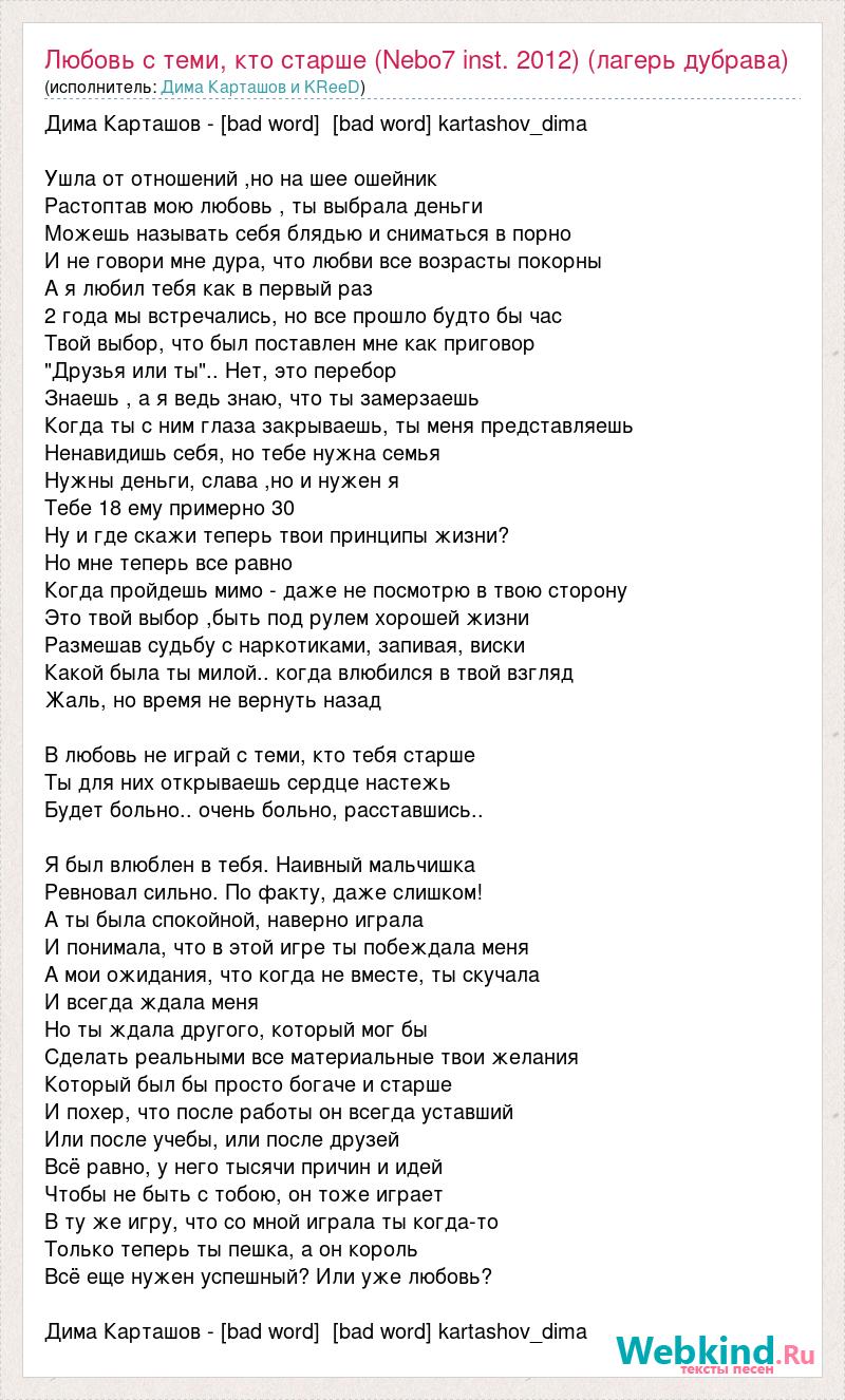 Главная→Исполнители→Дима Карташов и KReeD→Любовь с теми, кто старше (Nebo7 inst. 2012) (лагерь дубрава)