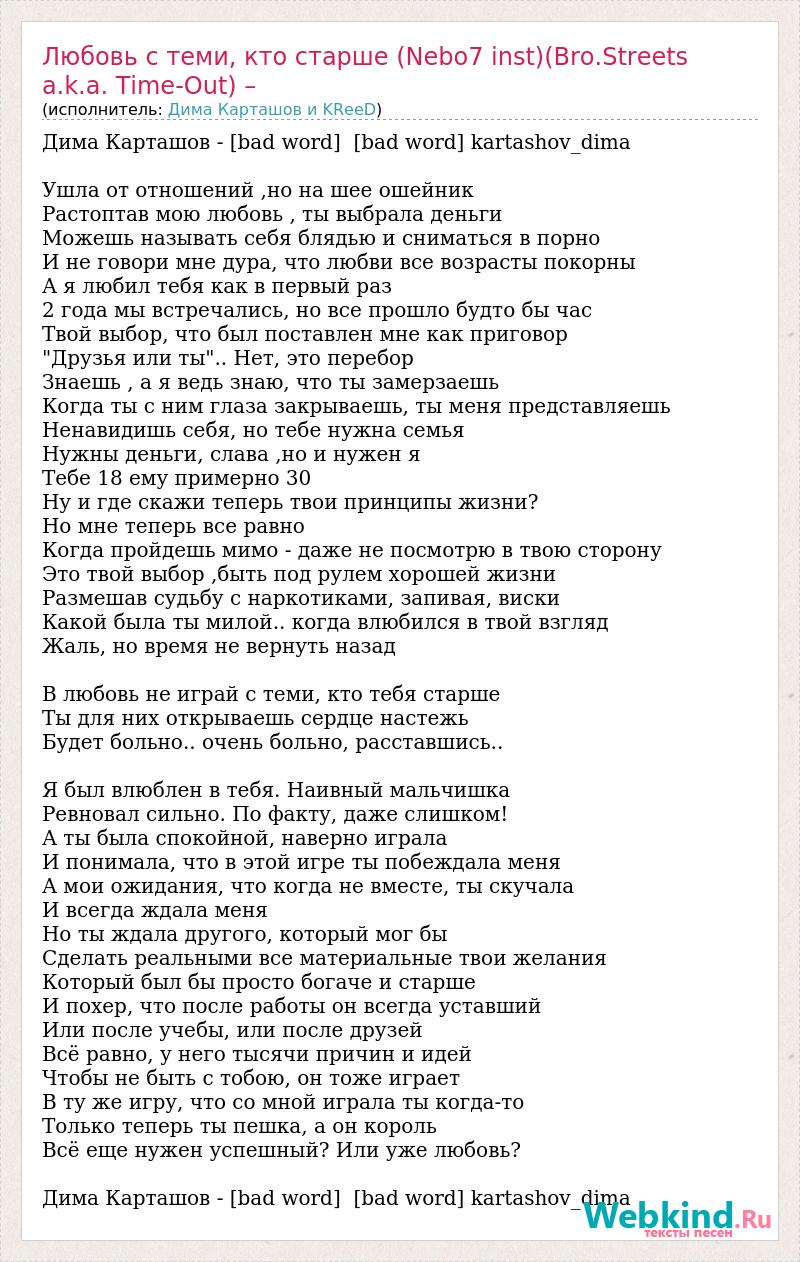 Главная→Исполнители→Дима Карташов и KReeD→Любовь с теми, кто старше (Nebo7 inst)(Bro.Streets a.k.a. Time-Out) –