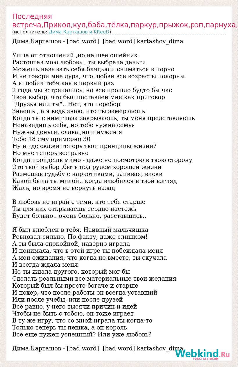 Дима Карташов - [bad word] [bad word] kartashov_dima Ушла от отношений ,но на шее ошейник Растоптав мою любовь , ты выбрала деньги Можешь называть себя блядью и сниматься в порно И не говори мне дура, что любви все возрасты покорны А я любил тебя как в первый раз 2 года мы встречались, но все прошло будто бы час Твой выбор, что был поставлен мне как приговор "Друзья или ты".. Нет, это перебор Знаешь , а я ведь знаю, что ты замерзаешь Когда ты с ним глаза закрываешь, ты меня представляешь Ненавидишь себя, но тебе нужна семья Нужны деньги, слава ,но и нужен я Тебе 18 ему примерно 30 Ну и где скажи теперь твои принципы жизни? Но мне теперь все равно Когда пройдешь мимо - даже не посмотрю в твою сторону Это твой выбор ,быть под рулем хорошей жизни Размешав судьбу с наркотиками, запивая, виски Какой была ты милой.. когда влюбился в твой взгляд Жаль, но время не вернуть назад В любовь не играй с теми, кто тебя старше Ты для них открываешь сердце настежь Будет больно.. очень больно, расставшись.. Я был влюблен в тебя. Наивный мальчишка Ревновал сильно. По факту, даже слишком! А ты была спокойной, наверно играла И понимала, что в этой игре ты побеждала меня А мои ожидания, что когда не вместе, ты скучала И всегда ждала меня Но ты ждала другого, который мог бы Сделать реальными все материальные твои желания Который был бы просто богаче и старше И похер, что после работы он всегда уставший Или после учебы, или после друзей Всё равно, у него тысячи причин и идей Чтобы не быть с тобою, он тоже играет В ту же игру, что со мной играла ты когда-то Только теперь ты пешка, а он король Всё еще нужен успешный? Или уже любовь? Дима Карташов - [bad word] [bad word] kartashov_dima