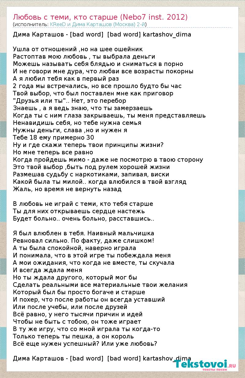 Дима Карташов - [bad word] [bad word] kartashov_dima Ушла от отношений ,но на шее ошейник Растоптав мою любовь , ты выбрала деньги Можешь называть себя блядью и сниматься в порно И не говори мне дура, что любви все возрасты покорны А я любил тебя как в первый раз 2 года мы встречались, но все прошло будто бы час Твой выбор, что был поставлен мне как приговор "Друзья или ты".. Нет, это перебор Знаешь , а я ведь знаю, что ты замерзаешь Когда ты с ним глаза закрываешь, ты меня представляешь Ненавидишь себя, но тебе нужна семья Нужны деньги, слава ,но и нужен я Тебе 18 ему примерно 30 Ну и где скажи теперь твои принципы жизни? Но мне теперь все равно Когда пройдешь мимо - даже не посмотрю в твою сторону Это твой выбор ,быть под рулем хорошей жизни Размешав судьбу с наркотиками, запивая, виски Какой была ты милой.. когда влюбился в твой взгляд Жаль, но время не вернуть назад В любовь не играй с теми, кто тебя старше Ты для них открываешь сердце настежь Будет больно.. очень больно, расставшись.. Я был влюблен в тебя. Наивный мальчишка Ревновал сильно. По факту, даже слишком! А ты была спокойной, наверно играла И понимала, что в этой игре ты побеждала меня А мои ожидания, что когда не вместе, ты скучала И всегда ждала меня Но ты ждала другого, который мог бы Сделать реальными все материальные твои желания Который был бы просто богаче и старше И похер, что после работы он всегда уставший Или после учебы, или после друзей Всё равно, у него тысячи причин и идей Чтобы не быть с тобою, он тоже играет В ту же игру, что со мной играла ты когда-то Только теперь ты пешка, а он король Всё еще нужен успешный? Или уже любовь? Дима Карташов - [bad word] [bad word] kartashov_dima
