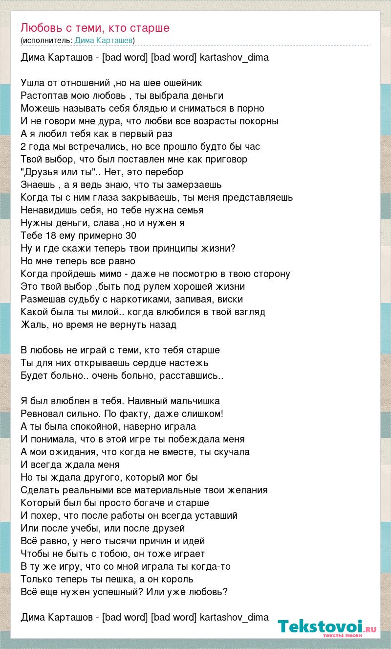Дима Карташов - [bad word] [bad word] kartashov_dima Ушла от отношений ,но на шее ошейник Растоптав мою любовь , ты выбрала деньги Можешь называть себя блядью и сниматься в порно И не говори мне дура, что любви все возрасты покорны А я любил тебя как в первый раз 2 года мы встречались, но все прошло будто бы час Твой выбор, что был поставлен мне как приговор "Друзья или ты".. Нет, это перебор Знаешь , а я ведь знаю, что ты замерзаешь Когда ты с ним глаза закрываешь, ты меня представляешь Ненавидишь себя, но тебе нужна семья Нужны деньги, слава ,но и нужен я Тебе 18 ему примерно 30 Ну и где скажи теперь твои принципы жизни? Но мне теперь все равно Когда пройдешь мимо - даже не посмотрю в твою сторону Это твой выбор ,быть под рулем хорошей жизни Размешав судьбу с наркотиками, запивая, виски Какой была ты милой.. когда влюбился в твой взгляд Жаль, но время не вернуть назад В любовь не играй с теми, кто тебя старше Ты для них открываешь сердце настежь Будет больно.. очень больно, расставшись.. Я был влюблен в тебя. Наивный мальчишка Ревновал сильно. По факту, даже слишком! А ты была спокойной, наверно играла И понимала, что в этой игре ты побеждала меня А мои ожидания, что когда не вместе, ты скучала И всегда ждала меня Но ты ждала другого, который мог бы Сделать реальными все материальные твои желания Который был бы просто богаче и старше И похер, что после работы он всегда уставший Или после учебы, или после друзей Всё равно, у него тысячи причин и идей Чтобы не быть с тобою, он тоже играет В ту же игру, что со мной играла ты когда-то Только теперь ты пешка, а он король Всё еще нужен успешный? Или уже любовь? Дима Карташов - [bad word] [bad word] kartashov_dima