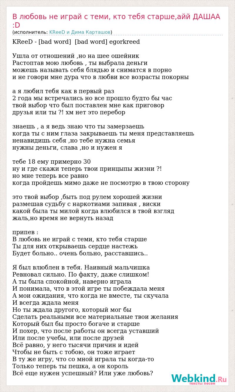 KReeD - [bad word] [bad word] egorkreed Ушла от отношений ,но на шее ошейник Растоптав мою любовь , ты выбрала деньги можешь называть себя блядью и сниматся в порно и не говори мне дура что в любви все возрасты покорны а я любил тебя как в первый раз 2 года мы встречались но все прошло будто бы час твой выбор что был поставлен мне как приговор друзья или ты ?! хм нет это перебор знаешь , а я ведь знаю что ты замерзаешь когда ты с ним глаза закрываешь ты меня представляешь ненавидишь себя ,но тебе нужна семья нужны деньги, слава ,но и нужен я тебе 18 ему примерно 30 ну и где скажи теперь твои принцыпы жизни ?! но мне теперь все равно когда пройдешь мимо даже не посмотрю в твою сторону это твой выбор ,быть под рулем хорошей жизни размешав судьбу с наркотиами запивая , виски какой была ты милой когда влюбился в твой взгляд жаль,но время не вернуть назад припев : В любовь не играй с теми, кто тебя старше Ты для них открываешь сердце настежь Будет больно.. очень больно, расставшись.. Я был влюблен в тебя. Наивный мальчишка Ревновал сильно. По факту, даже слишком! А ты была спокойной, наверно играла И понимала, что в этой игре ты побеждала меня А мои ожидания, что когда не вместе, ты скучала И всегда ждала меня Но ты ждала другого, который мог бы Сделать реальными все материальные твои желания Который был бы просто богаче и старше И похер, что после работы он всегда уставший Или после учебы, или после друзей Всё равно, у него тысячи причин и идей Чтобы не быть с тобою, он тоже играет В ту же игру, что со мной играла ты когда-то Только теперь ты пешка, а он король Всё еще нужен успешный? Или уже любовь?