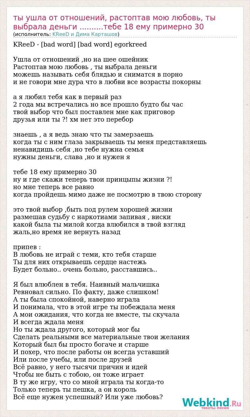 KReeD - [bad word] [bad word] egorkreed Ушла от отношений ,но на шее ошейник Растоптав мою любовь , ты выбрала деньги можешь называть себя блядью и сниматся в порно и не говори мне дура что в любви все возрасты покорны а я любил тебя как в первый раз 2 года мы встречались но все прошло будто бы час твой выбор что был поставлен мне как приговор друзья или ты ?! хм нет это перебор знаешь , а я ведь знаю что ты замерзаешь когда ты с ним глаза закрываешь ты меня представляешь ненавидишь себя ,но тебе нужна семья нужны деньги, слава ,но и нужен я тебе 18 ему примерно 30 ну и где скажи теперь твои принцыпы жизни ?! но мне теперь все равно когда пройдешь мимо даже не посмотрю в твою сторону это твой выбор ,быть под рулем хорошей жизни размешав судьбу с наркотиами запивая , виски какой была ты милой когда влюбился в твой взгляд жаль,но время не вернуть назад припев : В любовь не играй с теми, кто тебя старше Ты для них открываешь сердце настежь Будет больно.. очень больно, расставшись.. Я был влюблен в тебя. Наивный мальчишка Ревновал сильно. По факту, даже слишком! А ты была спокойной, наверно играла И понимала, что в этой игре ты побеждала меня А мои ожидания, что когда не вместе, ты скучала И всегда ждала меня Но ты ждала другого, который мог бы Сделать реальными все материальные твои желания Который был бы просто богаче и старше И похер, что после работы он всегда уставший Или после учебы, или после друзей Всё равно, у него тысячи причин и идей Чтобы не быть с тобою, он тоже играет В ту же игру, что со мной играла ты когда-то Только теперь ты пешка, а он король Всё еще нужен успешный? Или уже любовь?