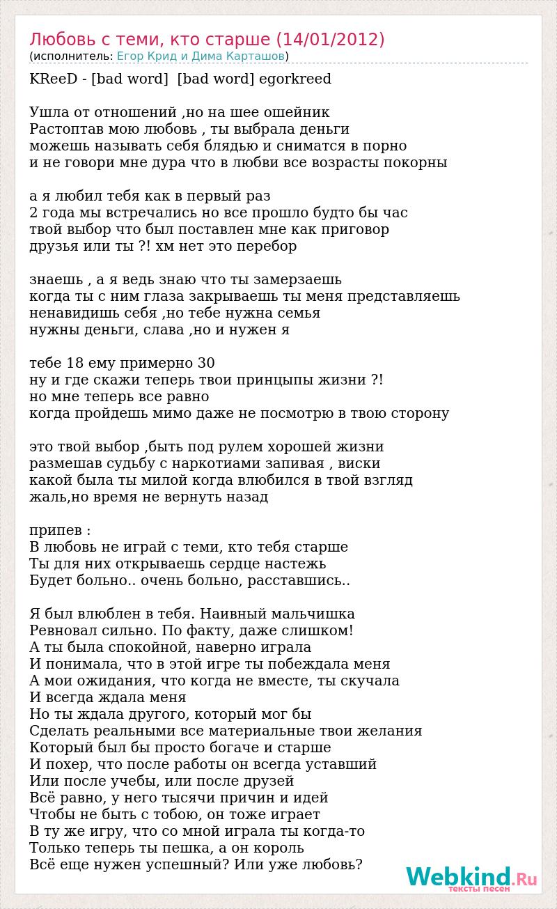 KReeD - [bad word] [bad word] egorkreed Ушла от отношений ,но на шее ошейник Растоптав мою любовь , ты выбрала деньги можешь называть себя блядью и сниматся в порно и не говори мне дура что в любви все возрасты покорны а я любил тебя как в первый раз 2 года мы встречались но все прошло будто бы час твой выбор что был поставлен мне как приговор друзья или ты ?! хм нет это перебор знаешь , а я ведь знаю что ты замерзаешь когда ты с ним глаза закрываешь ты меня представляешь ненавидишь себя ,но тебе нужна семья нужны деньги, слава ,но и нужен я тебе 18 ему примерно 30 ну и где скажи теперь твои принцыпы жизни ?! но мне теперь все равно когда пройдешь мимо даже не посмотрю в твою сторону это твой выбор ,быть под рулем хорошей жизни размешав судьбу с наркотиами запивая , виски какой была ты милой когда влюбился в твой взгляд жаль,но время не вернуть назад припев : В любовь не играй с теми, кто тебя старше Ты для них открываешь сердце настежь Будет больно.. очень больно, расставшись.. Я был влюблен в тебя. Наивный мальчишка Ревновал сильно. По факту, даже слишком! А ты была спокойной, наверно играла И понимала, что в этой игре ты побеждала меня А мои ожидания, что когда не вместе, ты скучала И всегда ждала меня Но ты ждала другого, который мог бы Сделать реальными все материальные твои желания Который был бы просто богаче и старше И похер, что после работы он всегда уставший Или после учебы, или после друзей Всё равно, у него тысячи причин и идей Чтобы не быть с тобою, он тоже играет В ту же игру, что со мной играла ты когда-то Только теперь ты пешка, а он король Всё еще нужен успешный? Или уже любовь?