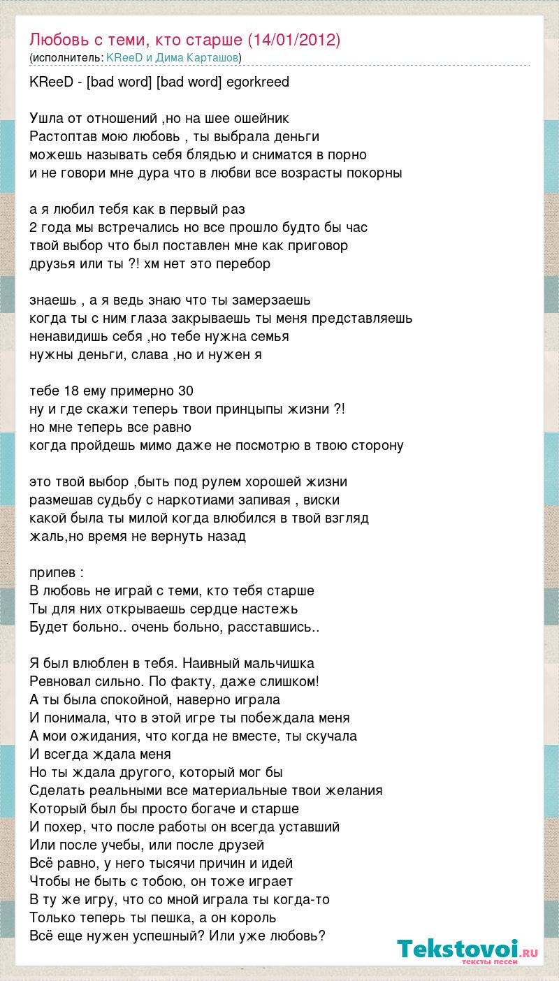 KReeD - [bad word] [bad word] egorkreed Ушла от отношений ,но на шее ошейник Растоптав мою любовь , ты выбрала деньги можешь называть себя блядью и сниматся в порно и не говори мне дура что в любви все возрасты покорны а я любил тебя как в первый раз 2 года мы встречались но все прошло будто бы час твой выбор что был поставлен мне как приговор друзья или ты ?! хм нет это перебор знаешь , а я ведь знаю что ты замерзаешь когда ты с ним глаза закрываешь ты меня представляешь ненавидишь себя ,но тебе нужна семья нужны деньги, слава ,но и нужен я тебе 18 ему примерно 30 ну и где скажи теперь твои принцыпы жизни ?! но мне теперь все равно когда пройдешь мимо даже не посмотрю в твою сторону это твой выбор ,быть под рулем хорошей жизни размешав судьбу с наркотиами запивая , виски какой была ты милой когда влюбился в твой взгляд жаль,но время не вернуть назад припев : В любовь не играй с теми, кто тебя старше Ты для них открываешь сердце настежь Будет больно.. очень больно, расставшись.. Я был влюблен в тебя. Наивный мальчишка Ревновал сильно. По факту, даже слишком! А ты была спокойной, наверно играла И понимала, что в этой игре ты побеждала меня А мои ожидания, что когда не вместе, ты скучала И всегда ждала меня Но ты ждала другого, который мог бы Сделать реальными все материальные твои желания Который был бы просто богаче и старше И похер, что после работы он всегда уставший Или после учебы, или после друзей Всё равно, у него тысячи причин и идей Чтобы не быть с тобою, он тоже играет В ту же игру, что со мной играла ты когда-то Только теперь ты пешка, а он король Всё еще нужен успешный? Или уже любовь?