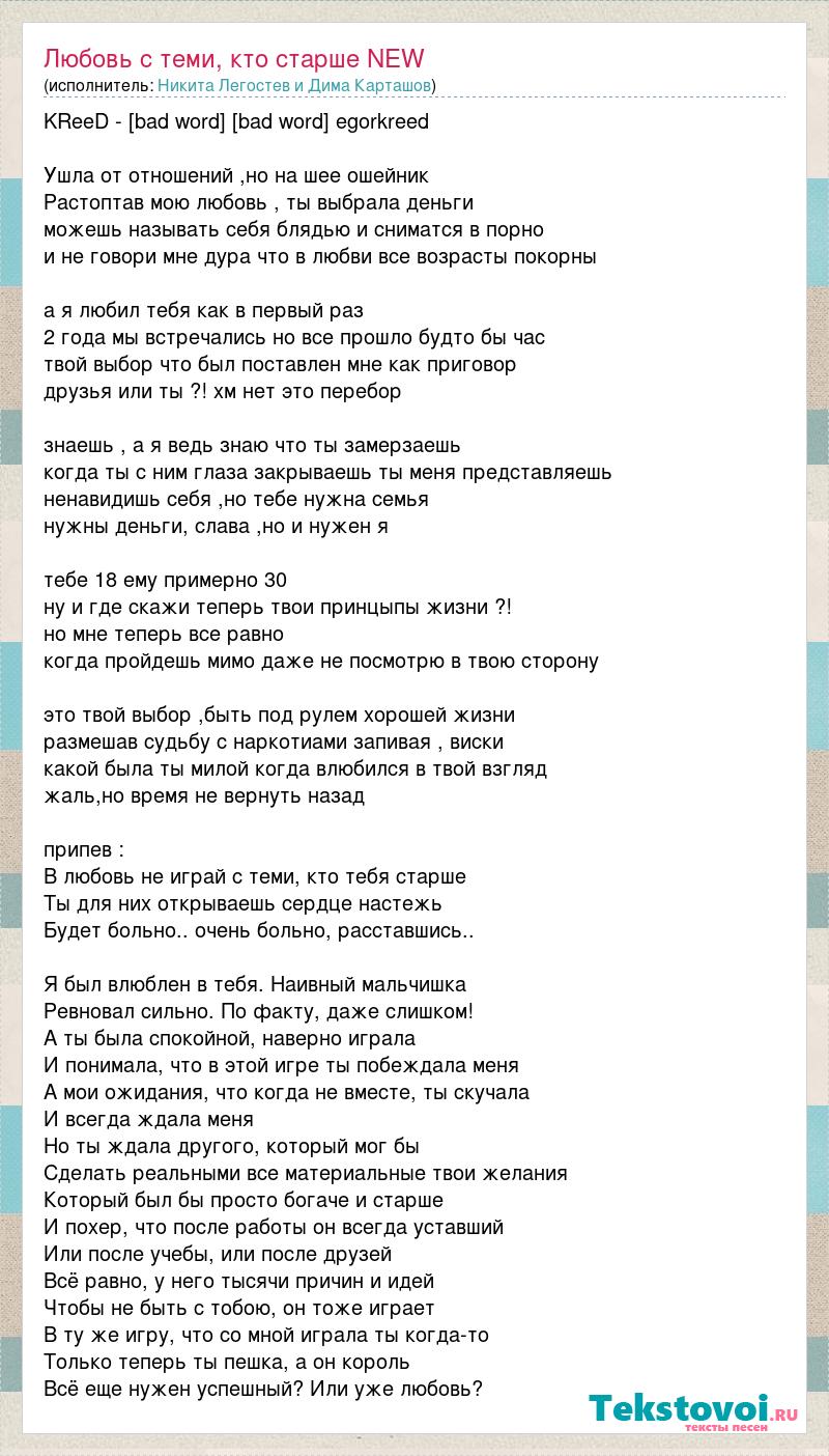 KReeD - [bad word] [bad word] egorkreed Ушла от отношений ,но на шее ошейник Растоптав мою любовь , ты выбрала деньги можешь называть себя блядью и сниматся в порно и не говори мне дура что в любви все возрасты покорны а я любил тебя как в первый раз 2 года мы встречались но все прошло будто бы час твой выбор что был поставлен мне как приговор друзья или ты ?! хм нет это перебор знаешь , а я ведь знаю что ты замерзаешь когда ты с ним глаза закрываешь ты меня представляешь ненавидишь себя ,но тебе нужна семья нужны деньги, слава ,но и нужен я тебе 18 ему примерно 30 ну и где скажи теперь твои принцыпы жизни ?! но мне теперь все равно когда пройдешь мимо даже не посмотрю в твою сторону это твой выбор ,быть под рулем хорошей жизни размешав судьбу с наркотиами запивая , виски какой была ты милой когда влюбился в твой взгляд жаль,но время не вернуть назад припев : В любовь не играй с теми, кто тебя старше Ты для них открываешь сердце настежь Будет больно.. очень больно, расставшись.. Я был влюблен в тебя. Наивный мальчишка Ревновал сильно. По факту, даже слишком! А ты была спокойной, наверно играла И понимала, что в этой игре ты побеждала меня А мои ожидания, что когда не вместе, ты скучала И всегда ждала меня Но ты ждала другого, который мог бы Сделать реальными все материальные твои желания Который был бы просто богаче и старше И похер, что после работы он всегда уставший Или после учебы, или после друзей Всё равно, у него тысячи причин и идей Чтобы не быть с тобою, он тоже играет В ту же игру, что со мной играла ты когда-то Только теперь ты пешка, а он король Всё еще нужен успешный? Или уже любовь?