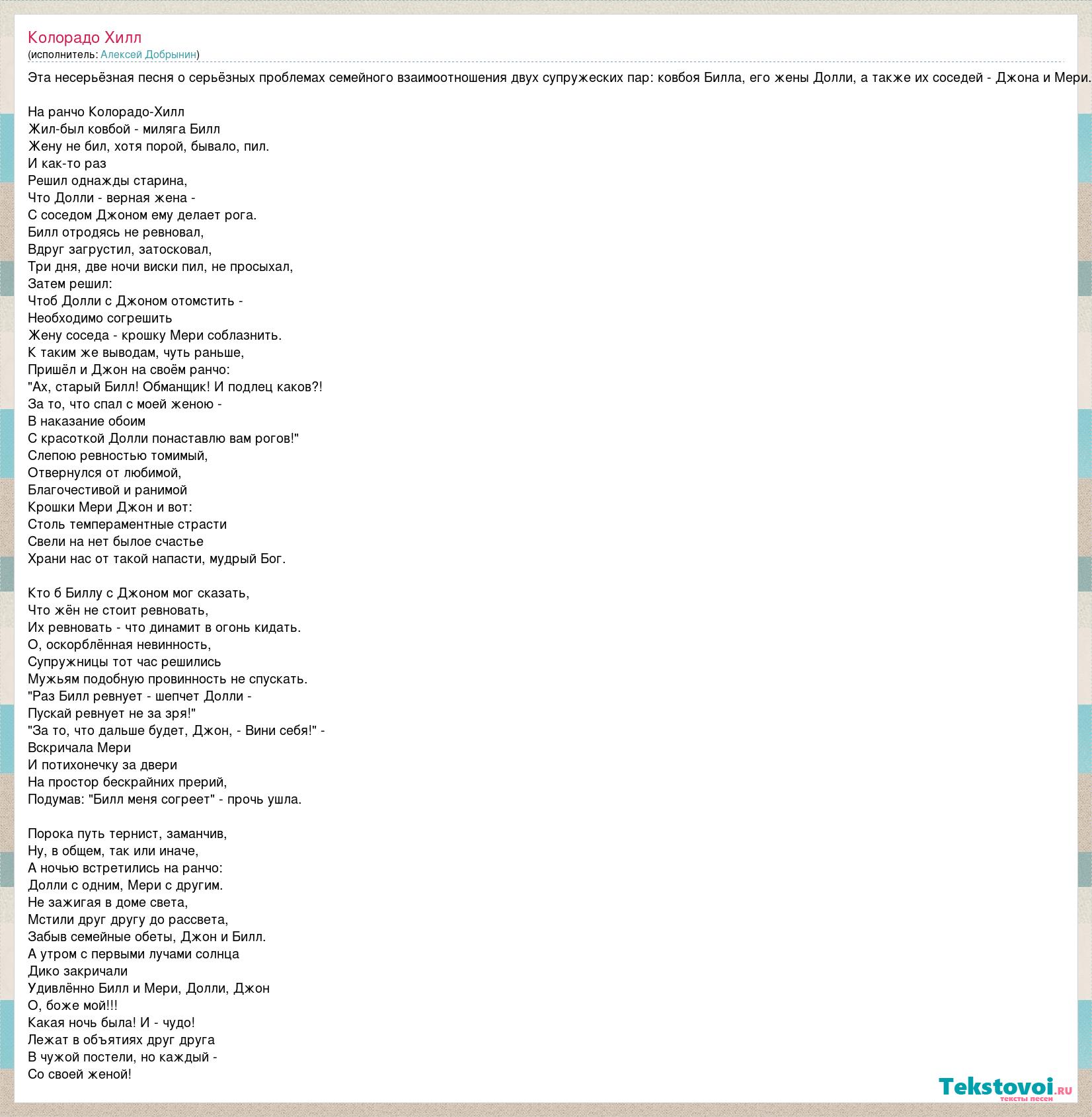 Эта несерьёзная песня о серьёзных проблемах семейного взаимоотношения двух супружеских пар: ковбоя Билла, его жены Долли, а также их соседей - Джона и Мери. На ранчо Колорадо-Хилл Жил-был ковбой - миляга Билл Жену не бил, хотя порой, бывало, пил. И как-то раз Решил однажды старина, Что Долли - верная жена - С соседом Джоном ему делает рога. Билл отродясь не ревновал, Вдруг загрустил, затосковал, Три дня, две ночи виски пил, не просыхал, Затем решил: Чтоб Долли с Джоном отомстить - Необходимо согрешить Жену соседа - крошку Мери соблазнить. К таким же выводам, чуть раньше, Пришёл и Джон на своём ранчо: "Ах, старый Билл! Обманщик! И подлец каков?! За то, что спал с моей женою - В наказание обоим С красоткой Долли понаставлю вам рогов!" Слепою ревностью томимый, Отвернулся от любимой, Благочестивой и ранимой Крошки Мери Джон и вот: Столь темпераментные страсти Свели на нет былое счастье Храни нас от такой напасти, мудрый Бог. Кто б Биллу с Джоном мог сказать, Что жён не стоит ревновать, Их ревновать - что динамит в огонь кидать. О, оскорблённая невинность, Супружницы тот час решились Мужьям подобную провинность не спускать. "Раз Билл ревнует - шепчет Долли - Пускай ревнует не за зря!" "За то, что дальше будет, Джон, - Вини себя!" - Вскричала Мери И потихонечку за двери На простор бескрайних прерий, Подумав: "Билл меня согреет" - прочь ушла. Порока путь тернист, заманчив, Ну, в общем, так или иначе, А ночью встретились на ранчо: Долли с одним, Мери с другим. Не зажигая в доме света, Мстили друг другу до рассвета, Забыв семейные обеты, Джон и Билл. А утром с первыми лучами солнца Дико закричали Удивлённо Билл и Мери, Долли, Джон О, боже мой!!! Какая ночь была! И - чудо! Лежат в объятиях друг друга В чужой постели, но каждый - Со своей женой!