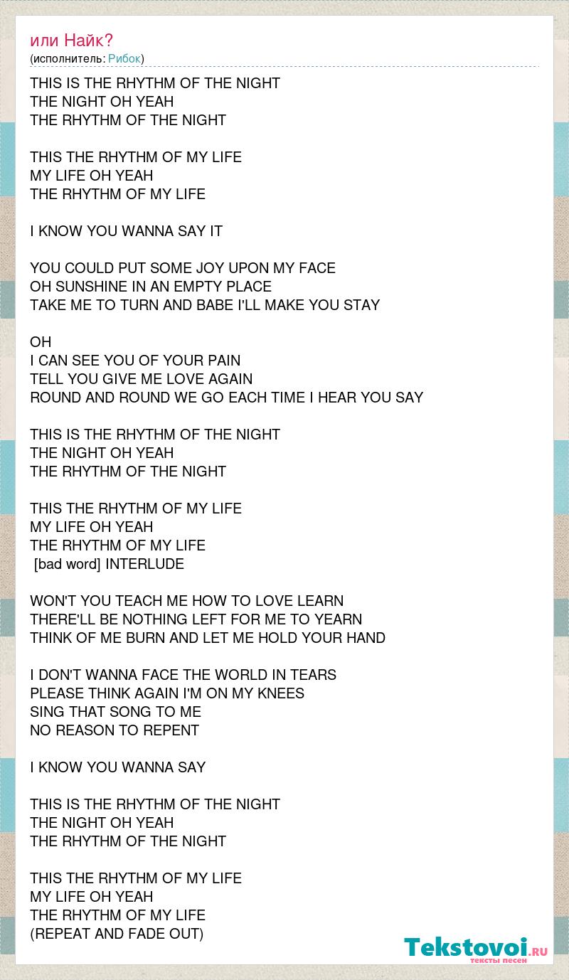 THIS IS THE RHYTHM OF THE NIGHT THE NIGHT OH YEAH THE RHYTHM OF THE NIGHT THIS THE RHYTHM OF MY LIFE MY LIFE OH YEAH THE RHYTHM OF MY LIFE I KNOW YOU WANNA SAY IT YOU COULD PUT SOME JOY UPON MY FACE OH SUNSHINE IN AN EMPTY PLACE TAKE ME TO TURN AND BABE I'LL MAKE YOU STAY OH I CAN SEE YOU OF YOUR PAIN TELL YOU GIVE ME LOVE AGAIN ROUND AND ROUND WE GO EACH TIME I HEAR YOU SAY THIS IS THE RHYTHM OF THE NIGHT THE NIGHT OH YEAH THE RHYTHM OF THE NIGHT THIS THE RHYTHM OF MY LIFE MY LIFE OH YEAH THE RHYTHM OF MY LIFE INSTRUMENTAL INTERLUDE WON'T YOU TEACH ME HOW TO LOVE LEARN THERE'LL BE NOTHING LEFT FOR ME TO YEARN THINK OF ME BURN AND LET ME HOLD YOUR HAND I DON'T WANNA FACE THE WORLD IN TEARS PLEASE THINK AGAIN I'M ON MY KNEES SING THAT SONG TO ME NO REASON TO REPENT I KNOW YOU WANNA SAY THIS IS THE RHYTHM OF THE NIGHT THE NIGHT OH YEAH THE RHYTHM OF THE NIGHT THIS THE RHYTHM OF MY LIFE MY LIFE OH YEAH THE RHYTHM OF MY LIFE (REPEAT AND FADE OUT)