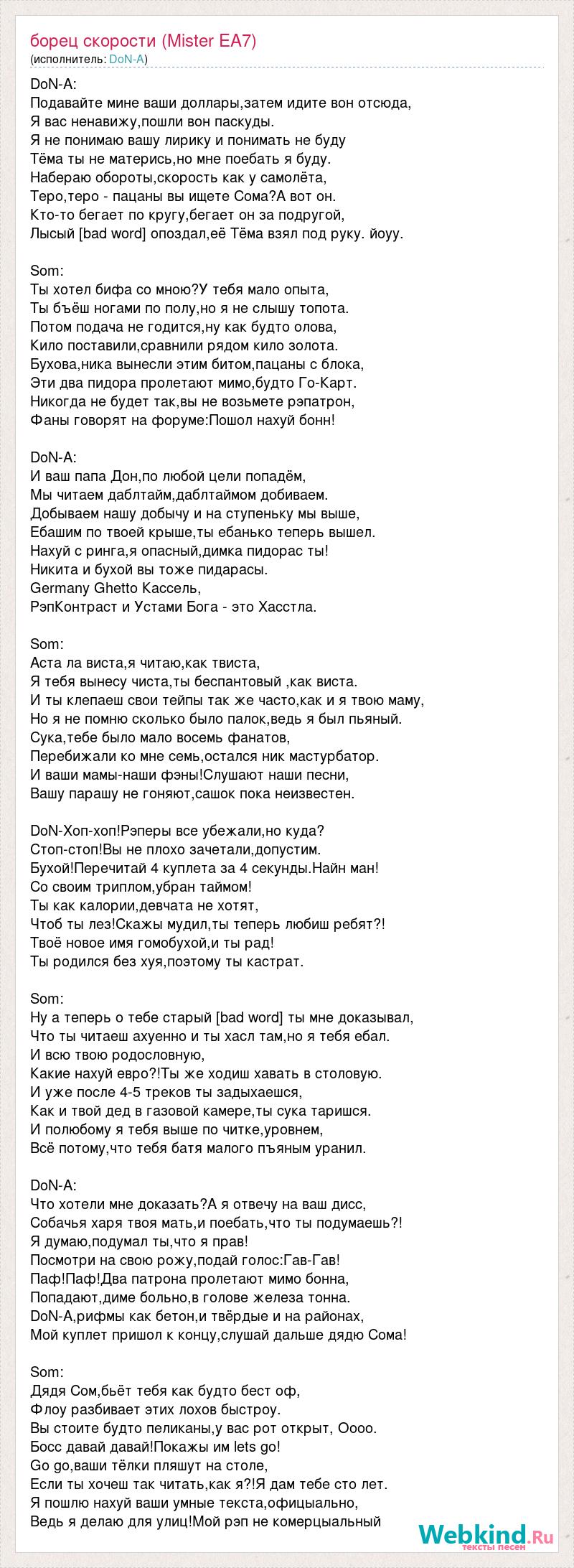 DoN-A: Подавайте мине ваши доллары,затем идите вон отсюда, Я вас ненавижу,пошли вон паскуды. Я не понимаю вашу лирику и понимать не буду Тёма ты не матерись,но мне поебать я буду. Набераю обороты,скорость как у самолёта, Теро,теро - пацаны вы ищете Сома?А вот он. Кто-то бегает по кругу,бегает он за подругой, Лысый [bad word] опоздал,её Тёма взял под руку. йоуу. Som: Ты хотел бифа со мною?У тебя мало опыта, Ты бъёш ногами по полу,но я не слышу топота. Потом подача не годится,ну как будто олова, Кило поставили,сравнили рядом кило золота. Бухова,ника вынесли этим битом,пацаны с блока, Эти два пидора пролетают мимо,будто Го-Карт. Никогда не будет так,вы не возьмете рэпатрон, Фаны говорят на форуме:Пошол нахуй бонн! DoN-A: И ваш папа Дон,по любой цели попадём, Мы читаем даблтайм,даблтаймом добиваем. Добываем нашу добычу и на ступеньку мы выше, Ебашим по твоей крыше,ты ебанько теперь вышел. Нахуй с ринга,я опасный,димка пидорас ты! Никита и бухой вы тоже пидарасы. Germany Ghetto Кассель, РэпКонтраст и Устами Бога - это Хасстла. Som: Аста ла виста,я читаю,как твиста, Я тебя вынесу чиста,ты беспантовый ,как виста. И ты клепаеш свои тейпы так же часто,как и я твою маму, Но я не помню сколько было палок,ведь я был пьяный. Сука,тебе было мало восемь фанатов, Перебижали ко мне семь,остался ник мастурбатор. И ваши мамы-наши фэны!Слушают наши песни, Вашу парашу не гоняют,сашок пока неизвестен. DoN-Хоп-хоп!Рэперы все убежали,но куда? Стоп-стоп!Вы не плохо зачетали,допустим. Бухой!Перечитай 4 куплета за 4 секунды.Найн ман! Со своим триплом,убран таймом! Ты как калории,девчата не хотят, Чтоб ты лез!Скажы мудил,ты теперь любиш ребят?! Твоё новое имя гомобухой,и ты рад! Ты родился без хуя,поэтому ты кастрат. Som: Ну а теперь о тебе старый [bad word] ты мне доказывал, Что ты читаеш ахуенно и ты хасл там,но я тебя ебал. И всю твою родословную, Какие нахуй евро?!Ты же ходиш хавать в столовую. И уже после 4-5 треков ты задыхаешся, Как и твой дед в газовой камере,ты сука таришся. И полюбому я тебя выше по читке,уровнем, Всё потому,что тебя батя малого пъяным уранил. DoN-A: Что хотели мне доказать?А я отвечу на ваш дисс, Собачья харя твоя мать,и поебать,что ты подумаешь?! Я думаю,подумал ты,что я прав! Посмотри на свою рожу,подай голос:Гав-Гав! Паф!Паф!Два патрона пролетают мимо бонна, Попадают,диме больно,в голове железа тонна. DoN-A,рифмы как бетон,и твёрдые и на районах, Мой куплет пришол к концу,слушай дальше дядю Сома! Som: Дядя Сом,бьёт тебя как будто бест оф, Флоу разбивает этих лохов быстроу. Вы стоите будто пеликаны,у вас рот открыт, Оооо. Босс давай давай!Покажы им lets go! Go go,ваши тёлки пляшут на столе, Если ты хочеш так читать,как я?!Я дам тебе сто лет. Я пошлю нахуй ваши умные текста,офицыально, Ведь я делаю для улиц!Мой рэп не комерцыальный