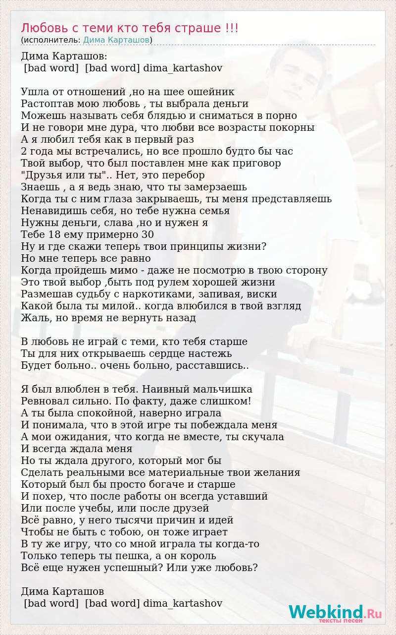 Дима Карташов: [bad word] [bad word] dima_kartashov Ушла от отношений ,но на шее ошейник Растоптав мою любовь , ты выбрала деньги Можешь называть себя блядью и сниматься в порно И не говори мне дура, что любви все возрасты покорны А я любил тебя как в первый раз 2 года мы встречались, но все прошло будто бы час Твой выбор, что был поставлен мне как приговор "Друзья или ты".. Нет, это перебор Знаешь , а я ведь знаю, что ты замерзаешь Когда ты с ним глаза закрываешь, ты меня представляешь Ненавидишь себя, но тебе нужна семья Нужны деньги, слава ,но и нужен я Тебе 18 ему примерно 30 Ну и где скажи теперь твои принципы жизни? Но мне теперь все равно Когда пройдешь мимо - даже не посмотрю в твою сторону Это твой выбор ,быть под рулем хорошей жизни Размешав судьбу с наркотиками, запивая, виски Какой была ты милой.. когда влюбился в твой взгляд Жаль, но время не вернуть назад В любовь не играй с теми, кто тебя старше Ты для них открываешь сердце настежь Будет больно.. очень больно, расставшись.. Я был влюблен в тебя. Наивный мальчишка Ревновал сильно. По факту, даже слишком! А ты была спокойной, наверно играла И понимала, что в этой игре ты побеждала меня А мои ожидания, что когда не вместе, ты скучала И всегда ждала меня Но ты ждала другого, который мог бы Сделать реальными все материальные твои желания Который был бы просто богаче и старше И похер, что после работы он всегда уставший Или после учебы, или после друзей Всё равно, у него тысячи причин и идей Чтобы не быть с тобою, он тоже играет В ту же игру, что со мной играла ты когда-то Только теперь ты пешка, а он король Всё еще нужен успешный? Или уже любовь? Дима Карташов [bad word] [bad word] dima_kartashov