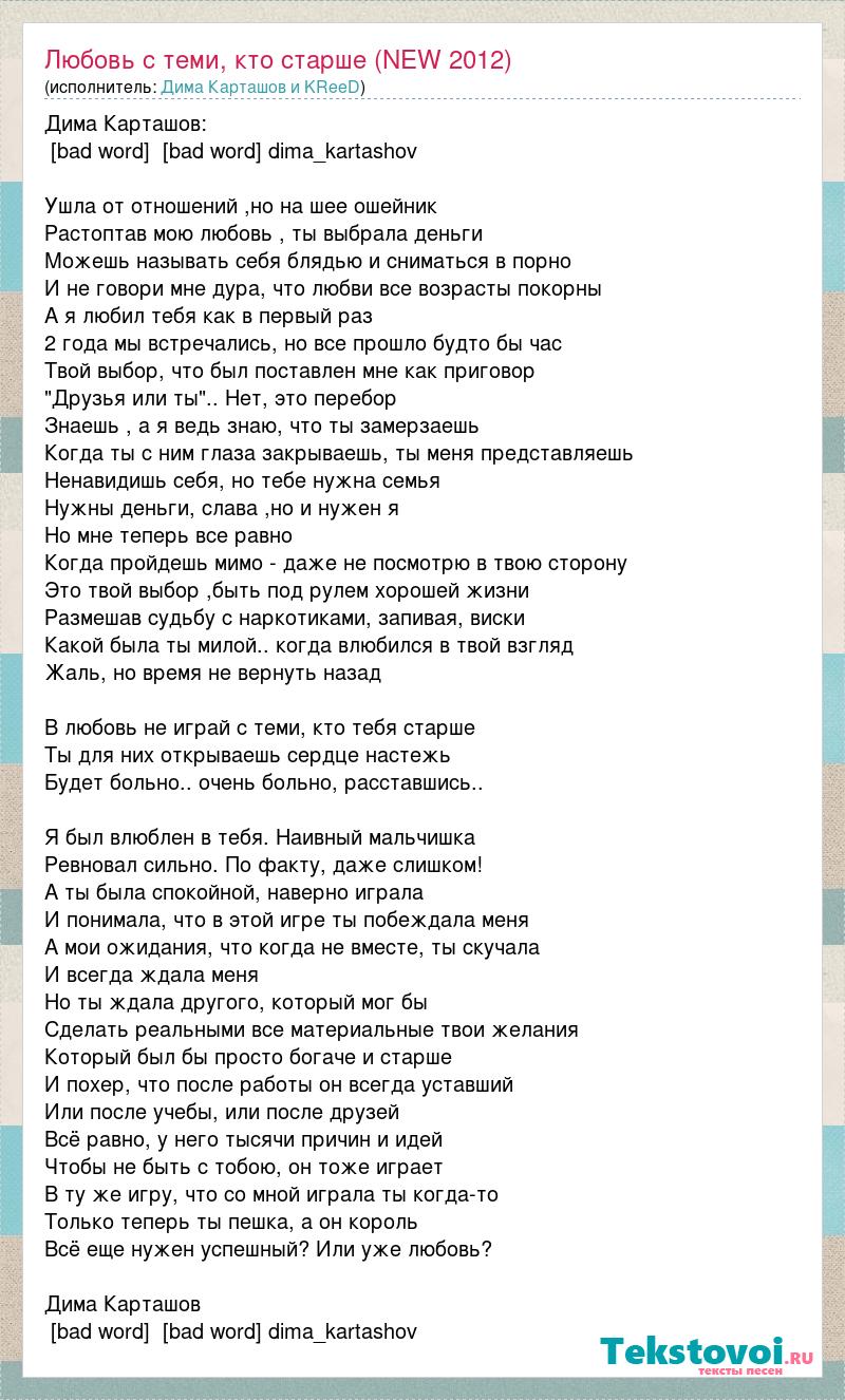Дима Карташов: [bad word] [bad word] dima_kartashov Ушла от отношений ,но на шее ошейник Растоптав мою любовь , ты выбрала деньги Можешь называть себя блядью и сниматься в порно И не говори мне дура, что любви все возрасты покорны А я любил тебя как в первый раз 2 года мы встречались, но все прошло будто бы час Твой выбор, что был поставлен мне как приговор "Друзья или ты".. Нет, это перебор Знаешь , а я ведь знаю, что ты замерзаешь Когда ты с ним глаза закрываешь, ты меня представляешь Ненавидишь себя, но тебе нужна семья Нужны деньги, слава ,но и нужен я Но мне теперь все равно Когда пройдешь мимо - даже не посмотрю в твою сторону Это твой выбор ,быть под рулем хорошей жизни Размешав судьбу с наркотиками, запивая, виски Какой была ты милой.. когда влюбился в твой взгляд Жаль, но время не вернуть назад В любовь не играй с теми, кто тебя старше Ты для них открываешь сердце настежь Будет больно.. очень больно, расставшись.. Я был влюблен в тебя. Наивный мальчишка Ревновал сильно. По факту, даже слишком! А ты была спокойной, наверно играла И понимала, что в этой игре ты побеждала меня А мои ожидания, что когда не вместе, ты скучала И всегда ждала меня Но ты ждала другого, который мог бы Сделать реальными все материальные твои желания Который был бы просто богаче и старше И похер, что после работы он всегда уставший Или после учебы, или после друзей Всё равно, у него тысячи причин и идей Чтобы не быть с тобою, он тоже играет В ту же игру, что со мной играла ты когда-то Только теперь ты пешка, а он король Всё еще нужен успешный? Или уже любовь? Дима Карташов [bad word] [bad word] dima_kartashov