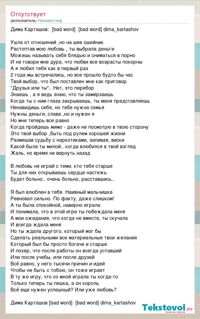 Дима Карташов: [bad word] [bad word] dima_kartashov Ушла от отношений ,но на шее ошейник Растоптав мою любовь , ты выбрала деньги Можешь называть себя блядью и сниматься в порно И не говори мне дура, что любви все возрасты покорны А я любил тебя как в первый раз 2 года мы встречались, но все прошло будто бы час Твой выбор, что был поставлен мне как приговор "Друзья или ты".. Нет, это перебор Знаешь , а я ведь знаю, что ты замерзаешь Когда ты с ним глаза закрываешь, ты меня представляешь Ненавидишь себя, но тебе нужна семья Нужны деньги, слава ,но и нужен я Но мне теперь все равно Когда пройдешь мимо - даже не посмотрю в твою сторону Это твой выбор ,быть под рулем хорошей жизни Размешав судьбу с наркотиками, запивая, виски Какой была ты милой.. когда влюбился в твой взгляд Жаль, но время не вернуть назад В любовь не играй с теми, кто тебя старше Ты для них открываешь сердце настежь Будет больно.. очень больно, расставшись.. Я был влюблен в тебя. Наивный мальчишка Ревновал сильно. По факту, даже слишком! А ты была спокойной, наверно играла И понимала, что в этой игре ты побеждала меня А мои ожидания, что когда не вместе, ты скучала И всегда ждала меня Но ты ждала другого, который мог бы Сделать реальными все материальные твои желания Который был бы просто богаче и старше И похер, что после работы он всегда уставший Или после учебы, или после друзей Всё равно, у него тысячи причин и идей Чтобы не быть с тобою, он тоже играет В ту же игру, что со мной играла ты когда-то Только теперь ты пешка, а он король Всё еще нужен успешный? Или уже любовь? Дима Карташов [bad word] [bad word] dima_kartashov