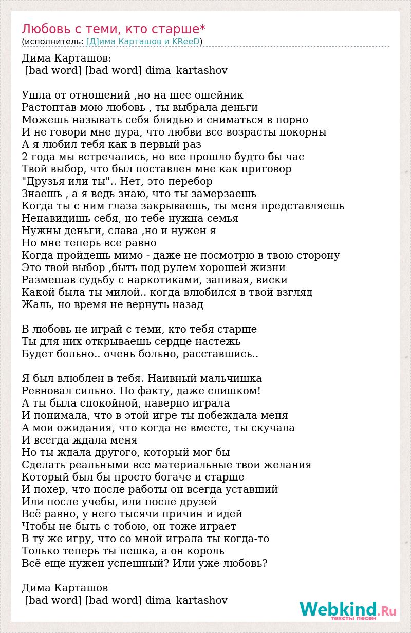 Дима Карташов: [bad word] [bad word] dima_kartashov Ушла от отношений ,но на шее ошейник Растоптав мою любовь , ты выбрала деньги Можешь называть себя блядью и сниматься в порно И не говори мне дура, что любви все возрасты покорны А я любил тебя как в первый раз 2 года мы встречались, но все прошло будто бы час Твой выбор, что был поставлен мне как приговор "Друзья или ты".. Нет, это перебор Знаешь , а я ведь знаю, что ты замерзаешь Когда ты с ним глаза закрываешь, ты меня представляешь Ненавидишь себя, но тебе нужна семья Нужны деньги, слава ,но и нужен я Но мне теперь все равно Когда пройдешь мимо - даже не посмотрю в твою сторону Это твой выбор ,быть под рулем хорошей жизни Размешав судьбу с наркотиками, запивая, виски Какой была ты милой.. когда влюбился в твой взгляд Жаль, но время не вернуть назад В любовь не играй с теми, кто тебя старше Ты для них открываешь сердце настежь Будет больно.. очень больно, расставшись.. Я был влюблен в тебя. Наивный мальчишка Ревновал сильно. По факту, даже слишком! А ты была спокойной, наверно играла И понимала, что в этой игре ты побеждала меня А мои ожидания, что когда не вместе, ты скучала И всегда ждала меня Но ты ждала другого, который мог бы Сделать реальными все материальные твои желания Который был бы просто богаче и старше И похер, что после работы он всегда уставший Или после учебы, или после друзей Всё равно, у него тысячи причин и идей Чтобы не быть с тобою, он тоже играет В ту же игру, что со мной играла ты когда-то Только теперь ты пешка, а он король Всё еще нужен успешный? Или уже любовь? Дима Карташов [bad word] [bad word] dima_kartashov