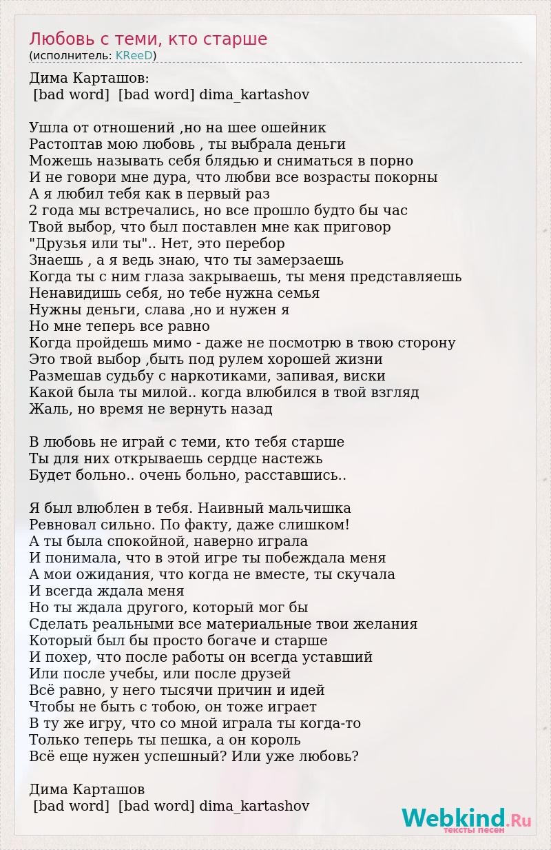 Дима Карташов: [bad word] [bad word] dima_kartashov Ушла от отношений ,но на шее ошейник Растоптав мою любовь , ты выбрала деньги Можешь называть себя блядью и сниматься в порно И не говори мне дура, что любви все возрасты покорны А я любил тебя как в первый раз 2 года мы встречались, но все прошло будто бы час Твой выбор, что был поставлен мне как приговор "Друзья или ты".. Нет, это перебор Знаешь , а я ведь знаю, что ты замерзаешь Когда ты с ним глаза закрываешь, ты меня представляешь Ненавидишь себя, но тебе нужна семья Нужны деньги, слава ,но и нужен я Но мне теперь все равно Когда пройдешь мимо - даже не посмотрю в твою сторону Это твой выбор ,быть под рулем хорошей жизни Размешав судьбу с наркотиками, запивая, виски Какой была ты милой.. когда влюбился в твой взгляд Жаль, но время не вернуть назад В любовь не играй с теми, кто тебя старше Ты для них открываешь сердце настежь Будет больно.. очень больно, расставшись.. Я был влюблен в тебя. Наивный мальчишка Ревновал сильно. По факту, даже слишком! А ты была спокойной, наверно играла И понимала, что в этой игре ты побеждала меня А мои ожидания, что когда не вместе, ты скучала И всегда ждала меня Но ты ждала другого, который мог бы Сделать реальными все материальные твои желания Который был бы просто богаче и старше И похер, что после работы он всегда уставший Или после учебы, или после друзей Всё равно, у него тысячи причин и идей Чтобы не быть с тобою, он тоже играет В ту же игру, что со мной играла ты когда-то Только теперь ты пешка, а он король Всё еще нужен успешный? Или уже любовь? Дима Карташов [bad word] [bad word] dima_kartashov