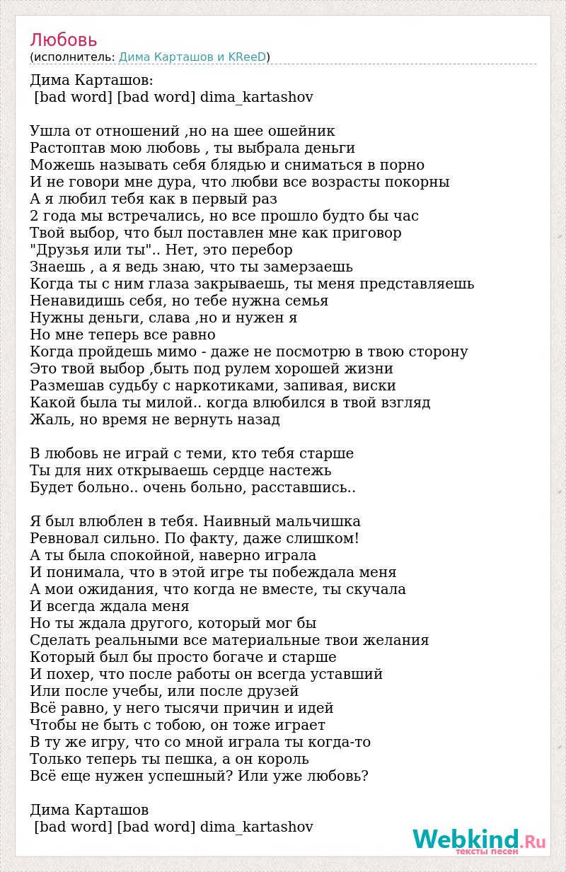 Дима Карташов: [bad word] [bad word] dima_kartashov Ушла от отношений ,но на шее ошейник Растоптав мою любовь , ты выбрала деньги Можешь называть себя блядью и сниматься в порно И не говори мне дура, что любви все возрасты покорны А я любил тебя как в первый раз 2 года мы встречались, но все прошло будто бы час Твой выбор, что был поставлен мне как приговор "Друзья или ты".. Нет, это перебор Знаешь , а я ведь знаю, что ты замерзаешь Когда ты с ним глаза закрываешь, ты меня представляешь Ненавидишь себя, но тебе нужна семья Нужны деньги, слава ,но и нужен я Но мне теперь все равно Когда пройдешь мимо - даже не посмотрю в твою сторону Это твой выбор ,быть под рулем хорошей жизни Размешав судьбу с наркотиками, запивая, виски Какой была ты милой.. когда влюбился в твой взгляд Жаль, но время не вернуть назад В любовь не играй с теми, кто тебя старше Ты для них открываешь сердце настежь Будет больно.. очень больно, расставшись.. Я был влюблен в тебя. Наивный мальчишка Ревновал сильно. По факту, даже слишком! А ты была спокойной, наверно играла И понимала, что в этой игре ты побеждала меня А мои ожидания, что когда не вместе, ты скучала И всегда ждала меня Но ты ждала другого, который мог бы Сделать реальными все материальные твои желания Который был бы просто богаче и старше И похер, что после работы он всегда уставший Или после учебы, или после друзей Всё равно, у него тысячи причин и идей Чтобы не быть с тобою, он тоже играет В ту же игру, что со мной играла ты когда-то Только теперь ты пешка, а он король Всё еще нужен успешный? Или уже любовь? Дима Карташов [bad word] [bad word] dima_kartashov