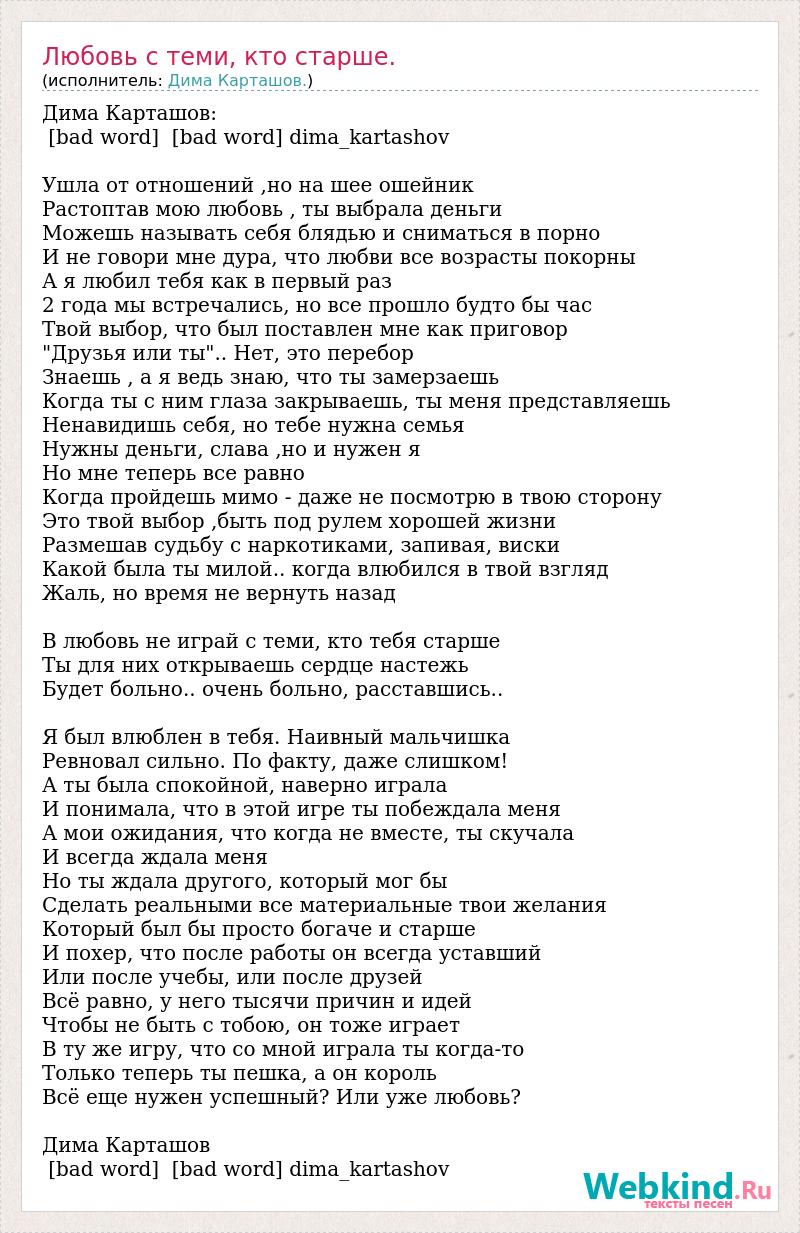 Дима Карташов: [bad word] [bad word] dima_kartashov Ушла от отношений ,но на шее ошейник Растоптав мою любовь , ты выбрала деньги Можешь называть себя блядью и сниматься в порно И не говори мне дура, что любви все возрасты покорны А я любил тебя как в первый раз 2 года мы встречались, но все прошло будто бы час Твой выбор, что был поставлен мне как приговор "Друзья или ты".. Нет, это перебор Знаешь , а я ведь знаю, что ты замерзаешь Когда ты с ним глаза закрываешь, ты меня представляешь Ненавидишь себя, но тебе нужна семья Нужны деньги, слава ,но и нужен я Но мне теперь все равно Когда пройдешь мимо - даже не посмотрю в твою сторону Это твой выбор ,быть под рулем хорошей жизни Размешав судьбу с наркотиками, запивая, виски Какой была ты милой.. когда влюбился в твой взгляд Жаль, но время не вернуть назад В любовь не играй с теми, кто тебя старше Ты для них открываешь сердце настежь Будет больно.. очень больно, расставшись.. Я был влюблен в тебя. Наивный мальчишка Ревновал сильно. По факту, даже слишком! А ты была спокойной, наверно играла И понимала, что в этой игре ты побеждала меня А мои ожидания, что когда не вместе, ты скучала И всегда ждала меня Но ты ждала другого, который мог бы Сделать реальными все материальные твои желания Который был бы просто богаче и старше И похер, что после работы он всегда уставший Или после учебы, или после друзей Всё равно, у него тысячи причин и идей Чтобы не быть с тобою, он тоже играет В ту же игру, что со мной играла ты когда-то Только теперь ты пешка, а он король Всё еще нужен успешный? Или уже любовь? Дима Карташов [bad word] [bad word] dima_kartashov