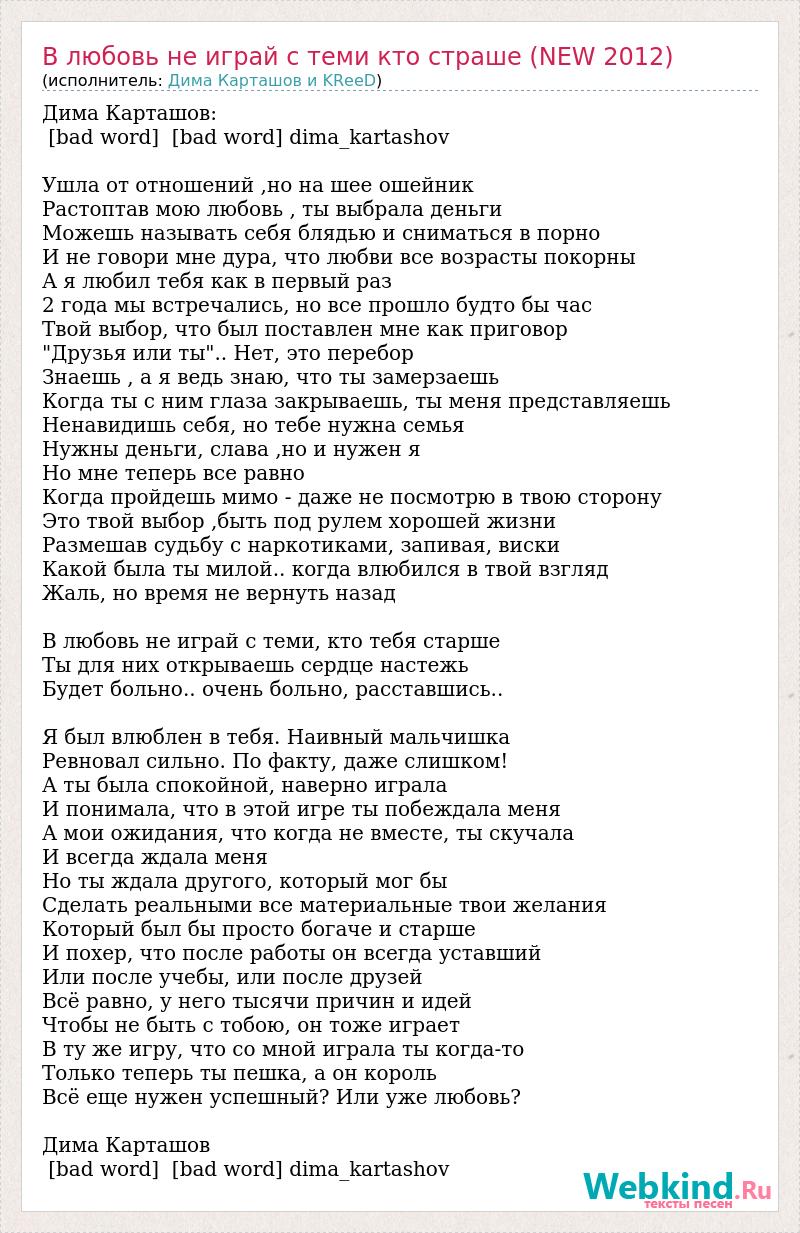 Дима Карташов: [bad word] [bad word] dima_kartashov Ушла от отношений ,но на шее ошейник Растоптав мою любовь , ты выбрала деньги Можешь называть себя блядью и сниматься в порно И не говори мне дура, что любви все возрасты покорны А я любил тебя как в первый раз 2 года мы встречались, но все прошло будто бы час Твой выбор, что был поставлен мне как приговор "Друзья или ты".. Нет, это перебор Знаешь , а я ведь знаю, что ты замерзаешь Когда ты с ним глаза закрываешь, ты меня представляешь Ненавидишь себя, но тебе нужна семья Нужны деньги, слава ,но и нужен я Но мне теперь все равно Когда пройдешь мимо - даже не посмотрю в твою сторону Это твой выбор ,быть под рулем хорошей жизни Размешав судьбу с наркотиками, запивая, виски Какой была ты милой.. когда влюбился в твой взгляд Жаль, но время не вернуть назад В любовь не играй с теми, кто тебя старше Ты для них открываешь сердце настежь Будет больно.. очень больно, расставшись.. Я был влюблен в тебя. Наивный мальчишка Ревновал сильно. По факту, даже слишком! А ты была спокойной, наверно играла И понимала, что в этой игре ты побеждала меня А мои ожидания, что когда не вместе, ты скучала И всегда ждала меня Но ты ждала другого, который мог бы Сделать реальными все материальные твои желания Который был бы просто богаче и старше И похер, что после работы он всегда уставший Или после учебы, или после друзей Всё равно, у него тысячи причин и идей Чтобы не быть с тобою, он тоже играет В ту же игру, что со мной играла ты когда-то Только теперь ты пешка, а он король Всё еще нужен успешный? Или уже любовь? Дима Карташов [bad word] [bad word] dima_kartashov