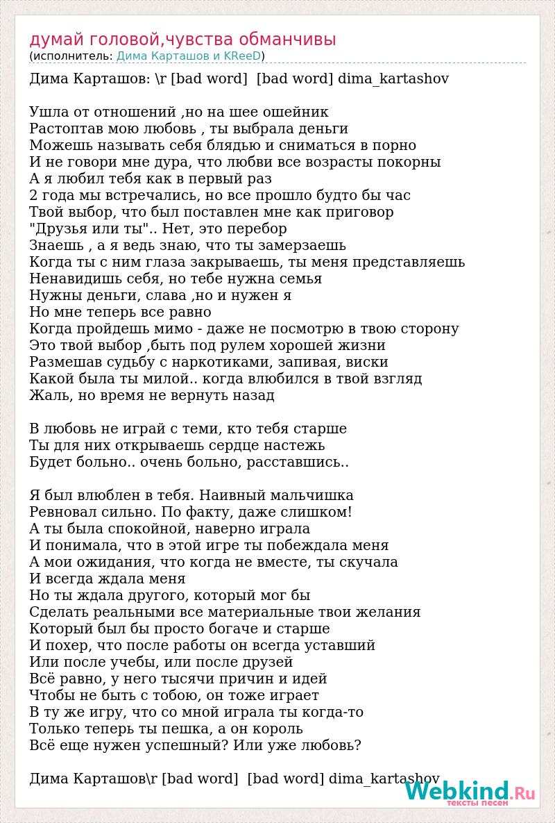 Дима Карташов: \r [bad word] [bad word] dima_kartashov Ушла от отношений ,но на шее ошейник Растоптав мою любовь , ты выбрала деньги Можешь называть себя блядью и сниматься в порно И не говори мне дура, что любви все возрасты покорны А я любил тебя как в первый раз 2 года мы встречались, но все прошло будто бы час Твой выбор, что был поставлен мне как приговор "Друзья или ты".. Нет, это перебор Знаешь , а я ведь знаю, что ты замерзаешь Когда ты с ним глаза закрываешь, ты меня представляешь Ненавидишь себя, но тебе нужна семья Нужны деньги, слава ,но и нужен я Но мне теперь все равно Когда пройдешь мимо - даже не посмотрю в твою сторону Это твой выбор ,быть под рулем хорошей жизни Размешав судьбу с наркотиками, запивая, виски Какой была ты милой.. когда влюбился в твой взгляд Жаль, но время не вернуть назад В любовь не играй с теми, кто тебя старше Ты для них открываешь сердце настежь Будет больно.. очень больно, расставшись.. Я был влюблен в тебя. Наивный мальчишка Ревновал сильно. По факту, даже слишком! А ты была спокойной, наверно играла И понимала, что в этой игре ты побеждала меня А мои ожидания, что когда не вместе, ты скучала И всегда ждала меня Но ты ждала другого, который мог бы Сделать реальными все материальные твои желания Который был бы просто богаче и старше И похер, что после работы он всегда уставший Или после учебы, или после друзей Всё равно, у него тысячи причин и идей Чтобы не быть с тобою, он тоже играет В ту же игру, что со мной играла ты когда-то Только теперь ты пешка, а он король Всё еще нужен успешный? Или уже любовь? Дима Карташов\r [bad word] [bad word] dima_kartashov