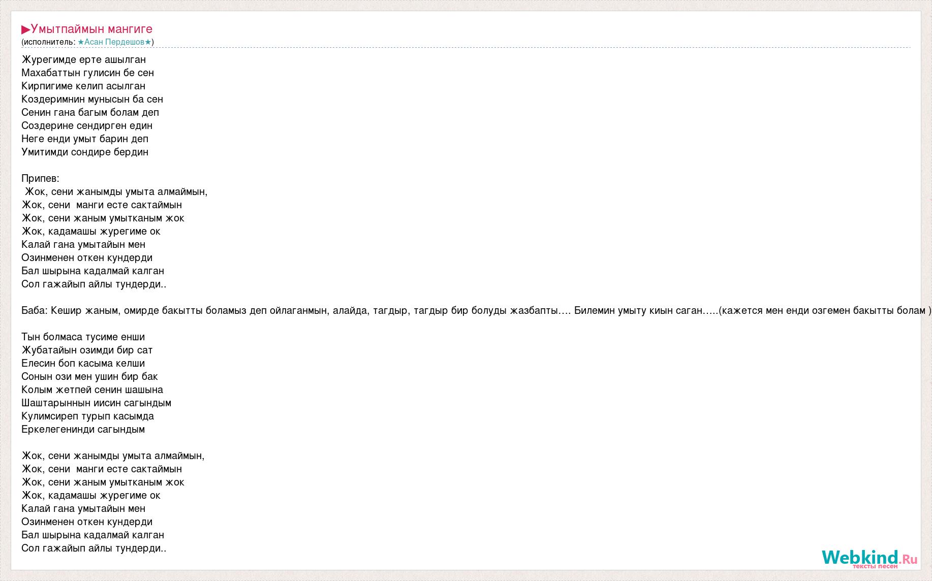 Журегимде ерте ашылган Махабаттын гулисин бе сен Кирпигиме келип асылган Коздеримнин мунысын ба сен Сенин гана багым болам деп Создерине сендирген един Неге енди умыт барин деп Умитимди сондире бердин Припев: Жок, сени жанымды умыта алмаймын, Жок, сени манги есте сактаймын Жок, сени жаным умытканым жок Жок, кадамашы журегиме ок Калай гана умытайын мен Озинменен откен кундерди Бал шырына кадалмай калган Сол гажайып айлы тундерди.. Баба: Кешир жаным, омирде бакытты боламыз деп ойлаганмын, алайда, тагдыр, тагдыр бир болуды жазбапты…. Билемин умыту киын саган…..(кажется мен енди озгемен бакытты болам ) Тын болмаса тусиме енши Жубатайын озимди бир сат Елесин боп касыма келши Сонын ози мен ушин бир бак Колым жетпей сенин шашына Шаштарыннын иисин сагындым Кулимсиреп турып касымда Еркелегенинди сагындым Жок, сени жанымды умыта алмаймын, Жок, сени манги есте сактаймын Жок, сени жаным умытканым жок Жок, кадамашы журегиме ок Калай гана умытайын мен Озинменен откен кундерди Бал шырына кадалмай калган Сол гажайып айлы тундерди..