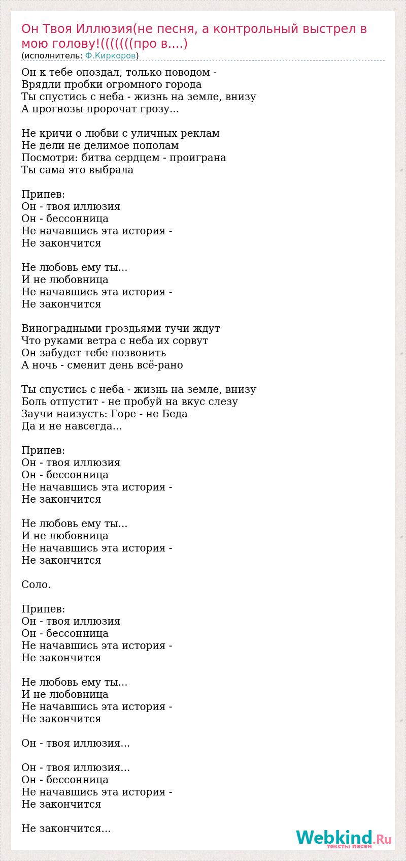 Он к тебе опоздал, только поводом - Врядли пробки огромного города Ты спустись с неба - жизнь на земле, внизу А прогнозы пророчат грозу... Не кричи о любви с уличных реклам Не дели не делимое пополам Посмотри: битва сердцем - проиграна Ты сама это выбрала Припев: Он - твоя иллюзия Он - бессонница Не начавшись эта история - Не закончится Не любовь ему ты... И не любовница Не начавшись эта история - Не закончится Виноградными гроздьями тучи ждут Что руками ветра с неба их сорвут Он забудет тебе позвонить А ночь - сменит день всё-рано Ты спустись с неба - жизнь на земле, внизу Боль отпустит - не пробуй на вкус слезу Заучи наизусть: Горе - не Беда Да и не навсегда... Припев: Он - твоя иллюзия Он - бессонница Не начавшись эта история - Не закончится Не любовь ему ты... И не любовница Не начавшись эта история - Не закончится Соло. Припев: Он - твоя иллюзия Он - бессонница Не начавшись эта история - Не закончится Не любовь ему ты... И не любовница Не начавшись эта история - Не закончится Он - твоя иллюзия... Он - твоя иллюзия... Он - бессонница Не начавшись эта история - Не закончится Не закончится...