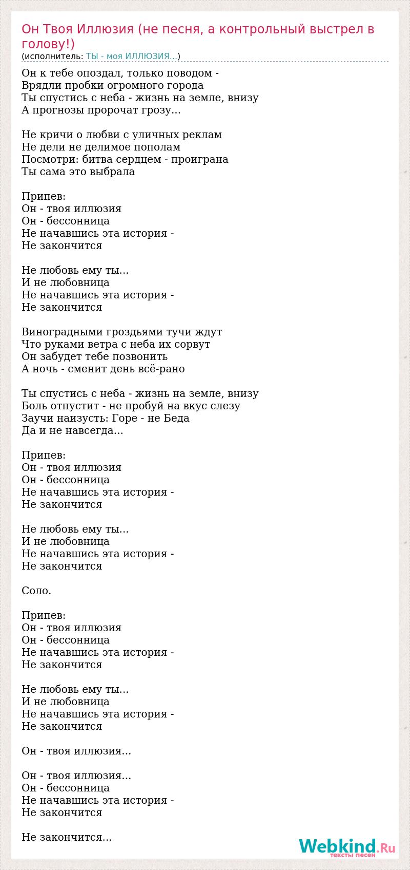 Он к тебе опоздал, только поводом - Врядли пробки огромного города Ты спустись с неба - жизнь на земле, внизу А прогнозы пророчат грозу... Не кричи о любви с уличных реклам Не дели не делимое пополам Посмотри: битва сердцем - проиграна Ты сама это выбрала Припев: Он - твоя иллюзия Он - бессонница Не начавшись эта история - Не закончится Не любовь ему ты... И не любовница Не начавшись эта история - Не закончится Виноградными гроздьями тучи ждут Что руками ветра с неба их сорвут Он забудет тебе позвонить А ночь - сменит день всё-рано Ты спустись с неба - жизнь на земле, внизу Боль отпустит - не пробуй на вкус слезу Заучи наизусть: Горе - не Беда Да и не навсегда... Припев: Он - твоя иллюзия Он - бессонница Не начавшись эта история - Не закончится Не любовь ему ты... И не любовница Не начавшись эта история - Не закончится Соло. Припев: Он - твоя иллюзия Он - бессонница Не начавшись эта история - Не закончится Не любовь ему ты... И не любовница Не начавшись эта история - Не закончится Он - твоя иллюзия... Он - твоя иллюзия... Он - бессонница Не начавшись эта история - Не закончится Не закончится...