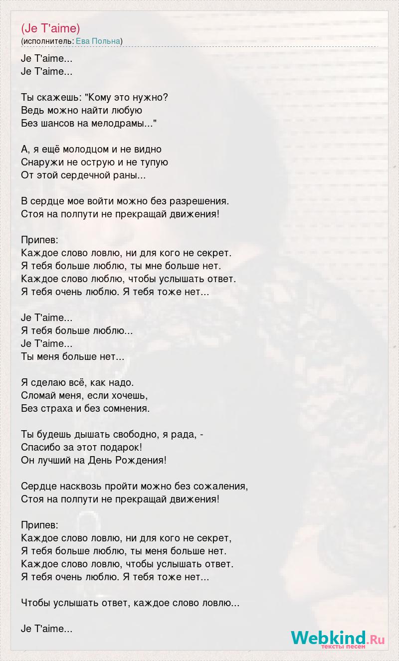 Je T'aime... Je T'aime... Ты скажешь: "Кому это нужно? Ведь можно найти любую Без шансов на мелодрамы..." А, я ещё молодцом и не видно Снаружи не острую и не тупую От этой сердечной раны... В сердце мое войти можно без разрешения. Стоя на полпути не прекращай движения! Припев: Каждое слово ловлю, ни для кого не секрет. Я тебя больше люблю, ты мне больше нет. Каждое слово люблю, чтобы услышать ответ. Я тебя очень люблю. Я тебя тоже нет... Je T'aime... Я тебя больше люблю... Je T'aime... Ты меня больше нет... Я сделаю всё, как надо. Сломай меня, если хочешь, Без страха и без сомнения. Ты будешь дышать свободно, я рада, - Спасибо за этот подарок! Он лучший на День Рождения! Сердце насквозь пройти можно без сожаления, Стоя на полпути не прекращай движения! Припев: Каждое слово ловлю, ни для кого не секрет, Я тебя больше люблю, ты меня больше нет. Каждое слово ловлю, чтобы услышать ответ. Я тебя очень люблю. Я тебя тоже нет... Чтобы услышать ответ, каждое слово ловлю... Je T'aime...