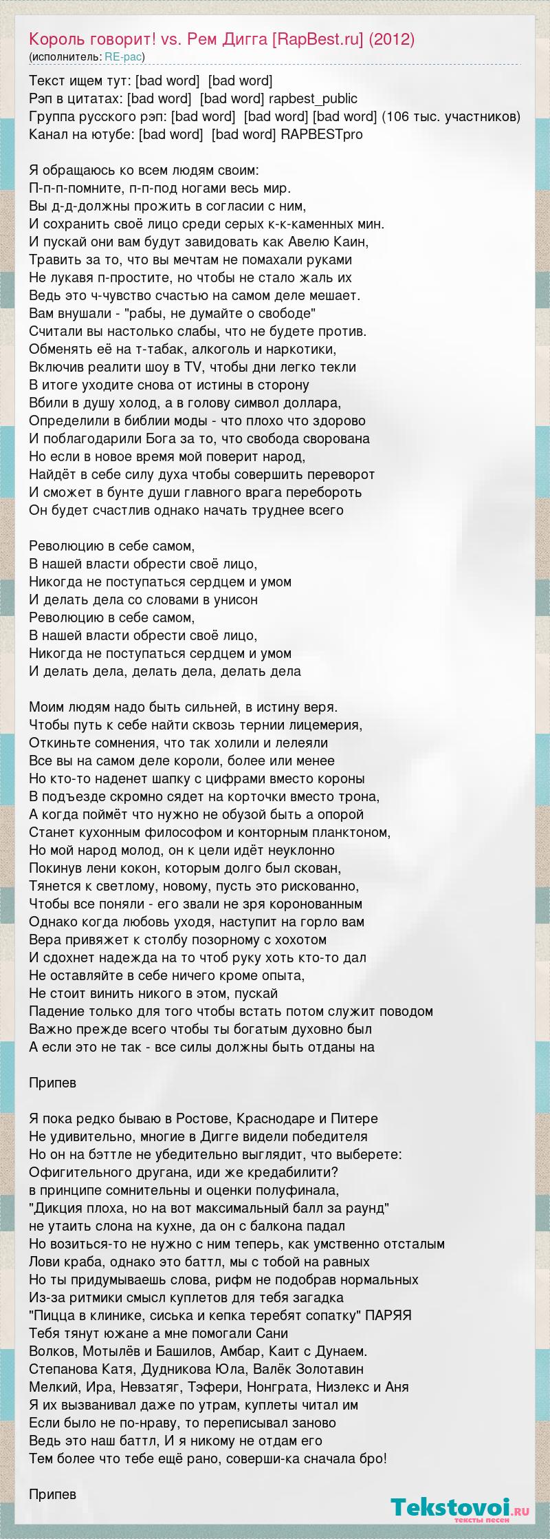 Текст ищем тут: [bad word] [bad word] Рэп в цитатах: [bad word] [bad word] rapbest_public Группа русского рэп: [bad word] [bad word] rapbestru (106 тыс. участников) Канал на ютубе: [bad word] [bad word] RAPBESTpro Я обращаюсь ко всем людям своим: П-п-п-помните, п-п-под ногами весь мир. Вы д-д-должны прожить в согласии с ним, И сохранить своё лицо среди серых к-к-каменных мин. И пускай они вам будут завидовать как Авелю Каин, Травить за то, что вы мечтам не помахали руками Не лукавя п-простите, но чтобы не стало жаль их Ведь это ч-чувство счастью на самом деле мешает. Вам внушали - "рабы, не думайте о свободе" Считали вы настолько слабы, что не будете против. Обменять её на т-табак, алкоголь и наркотики, Включив реалити шоу в TV, чтобы дни легко текли В итоге уходите снова от истины в сторону Вбили в душу холод, а в голову символ доллара, Определили в библии моды - что плохо что здорово И поблагодарили Бога за то, что свобода сворована Но если в новое время мой поверит народ, Найдёт в себе силу духа чтобы совершить переворот И сможет в бунте души главного врага перебороть Он будет счастлив однако начать труднее всего Революцию в себе самом, В нашей власти обрести своё лицо, Никогда не поступаться сердцем и умом И делать дела со словами в унисон Революцию в себе самом, В нашей власти обрести своё лицо, Никогда не поступаться сердцем и умом И делать дела, делать дела, делать дела Моим людям надо быть сильней, в истину веря. Чтобы путь к себе найти сквозь тернии лицемерия, Откиньте сомнения, что так холили и лелеяли Все вы на самом деле короли, более или менее Но кто-то наденет шапку с цифрами вместо короны В подъезде скромно сядет на корточки вместо трона, А когда поймёт что нужно не обузой быть а опорой Станет кухонным философом и конторным планктоном, Но мой народ молод, он к цели идёт неуклонно Покинув лени кокон, которым долго был скован, Тянется к светлому, новому, пусть это рискованно, Чтобы все поняли - его звали не зря коронованным Однако когда любовь уходя, наступит на горло вам Вера привяжет к столбу позорному с хохотом И сдохнет надежда на то чтоб руку хоть кто-то дал Не оставляйте в себе ничего кроме опыта, Не стоит винить никого в этом, пускай Падение только для того чтобы встать потом служит поводом Важно прежде всего чтобы ты богатым духовно был А если это не так - все силы должны быть отданы на Припев Я пока редко бываю в Ростове, Краснодаре и Питере Не удивительно, многие в Дигге видели победителя Но он на бэттле не убедительно выглядит, что выберете: Офигительного другана, иди же кредабилити? в принципе сомнительны и оценки полуфинала, "Дикция плоха, но на вот максимальный балл за раунд" не утаить слона на кухне, да он с балкона падал Но возиться-то не нужно с ним теперь, как умственно отсталым Лови краба, однако это баттл, мы с тобой на равных Но ты придумываешь слова, рифм не подобрав нормальных Из-за ритмики смысл куплетов для тебя загадка "Пицца в клинике, сиська и кепка теребят сопатку" ПАРЯЯ Тебя тянут южане а мне помогали Сани Волков, Мотылёв и Башилов, Амбар, Каит с Дунаем. Степанова Катя, Дудникова Юла, Валёк Золотавин Мелкий, Ира, Невзатяг, Тэфери, Нонграта, Низлекс и Аня Я их вызванивал даже по утрам, куплеты читал им Если было не по-нраву, то переписывал заново Ведь это наш баттл, И я никому не отдам его Тем более что тебе ещё рано, соверши-ка сначала бро! Припев