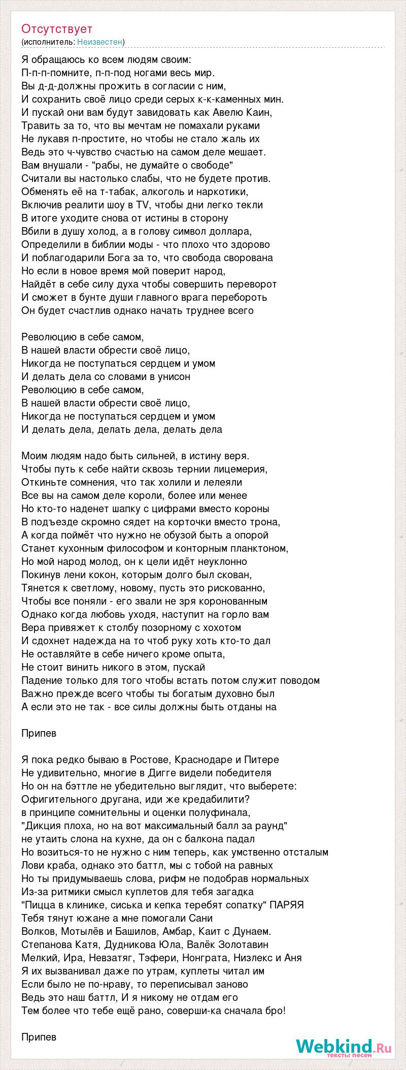 Я обращаюсь ко всем людям своим: П-п-п-помните, п-п-под ногами весь мир. Вы д-д-должны прожить в согласии с ним, И сохранить своё лицо среди серых к-к-каменных мин. И пускай они вам будут завидовать как Авелю Каин, Травить за то, что вы мечтам не помахали руками Не лукавя п-простите, но чтобы не стало жаль их Ведь это ч-чувство счастью на самом деле мешает. Вам внушали - "рабы, не думайте о свободе" Считали вы настолько слабы, что не будете против. Обменять её на т-табак, алкоголь и наркотики, Включив реалити шоу в TV, чтобы дни легко текли В итоге уходите снова от истины в сторону Вбили в душу холод, а в голову символ доллара, Определили в библии моды - что плохо что здорово И поблагодарили Бога за то, что свобода сворована Но если в новое время мой поверит народ, Найдёт в себе силу духа чтобы совершить переворот И сможет в бунте души главного врага перебороть Он будет счастлив однако начать труднее всего Революцию в себе самом, В нашей власти обрести своё лицо, Никогда не поступаться сердцем и умом И делать дела со словами в унисон Революцию в себе самом, В нашей власти обрести своё лицо, Никогда не поступаться сердцем и умом И делать дела, делать дела, делать дела Моим людям надо быть сильней, в истину веря. Чтобы путь к себе найти сквозь тернии лицемерия, Откиньте сомнения, что так холили и лелеяли Все вы на самом деле короли, более или менее Но кто-то наденет шапку с цифрами вместо короны В подъезде скромно сядет на корточки вместо трона, А когда поймёт что нужно не обузой быть а опорой Станет кухонным философом и конторным планктоном, Но мой народ молод, он к цели идёт неуклонно Покинув лени кокон, которым долго был скован, Тянется к светлому, новому, пусть это рискованно, Чтобы все поняли - его звали не зря коронованным Однако когда любовь уходя, наступит на горло вам Вера привяжет к столбу позорному с хохотом И сдохнет надежда на то чтоб руку хоть кто-то дал Не оставляйте в себе ничего кроме опыта, Не стоит винить никого в этом, пускай Падение только для того чтобы встать потом служит поводом Важно прежде всего чтобы ты богатым духовно был А если это не так - все силы должны быть отданы на Припев Я пока редко бываю в Ростове, Краснодаре и Питере Не удивительно, многие в Дигге видели победителя Но он на бэттле не убедительно выглядит, что выберете: Офигительного другана, иди же кредабилити? в принципе сомнительны и оценки полуфинала, "Дикция плоха, но на вот максимальный балл за раунд" не утаить слона на кухне, да он с балкона падал Но возиться-то не нужно с ним теперь, как умственно отсталым Лови краба, однако это баттл, мы с тобой на равных Но ты придумываешь слова, рифм не подобрав нормальных Из-за ритмики смысл куплетов для тебя загадка "Пицца в клинике, сиська и кепка теребят сопатку" ПАРЯЯ Тебя тянут южане а мне помогали Сани Волков, Мотылёв и Башилов, Амбар, Каит с Дунаем. Степанова Катя, Дудникова Юла, Валёк Золотавин Мелкий, Ира, Невзатяг, Тэфери, Нонграта, Низлекс и Аня Я их вызванивал даже по утрам, куплеты читал им Если было не по-нраву, то переписывал заново Ведь это наш баттл, И я никому не отдам его Тем более что тебе ещё рано, соверши-ка сначала бро! Припев