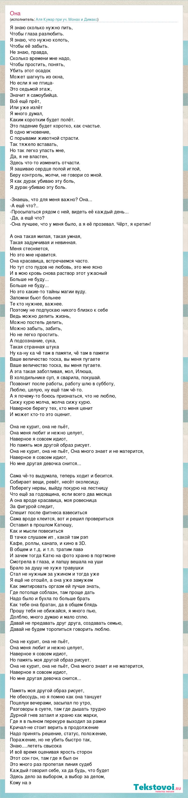 Я знаю сколько нужно пить, Чтобы глаза разлюбить. Я знаю, что нужно колоть, Чтобы её забыть. Не знаю, правда, Сколько времени мне надо, Чтобы простить, понять, Убить этот осадок Может шагнуть из окна, Но если я не птица- Это седьмой этаж, Значит я самоубийца. Всё ещё прёт, Или уже излёт Я много думал, Каким коротким будет полёт. Это падение будет коротко, как счастье. В одно мгновение, С порывами животной страсти. Так тяжело вставать, Но так легко упасть мне, Да, я не властен, Здесь что-то изменить отчасти. Я зашиваю сердце полой иглой, Беру контроль, молчи, не говори со мной. Я как дурак убиваю эту боль, Я дурак-убиваю эту боль. -Знаешь, что для меня важно? Она... -А ещё что?.. -Просыпаться рядом с ней, видеть её каждый день... -Да, а ещё что? -Она лучшее, что у меня было, а я её прозевал. Чёрт, я кретин! А она такая милая, такая умная, Такая задумчивая и невинная. Меня стесняется, Но это мне нравится. Она красавица, встречаемся часто. Но тут сто пудов не любовь, это мне ясно И в мою кровь снова раствор этот ужасный Больше не буду... Больше не буду... Но это какие-то тайны магии вуду. Запомни бьют больнее Те кто нужнее, важнее. Поэтому не подпускаю никого близко к себе Ведь можно делить жизнь, Можно постель делить, Можно забыть, забить, Но не легко простить. А подсознание, сука, Такая странная штука Ну ка-ну ка чё там в памяти, чё там в памяти Ваше величество тоска, вы меня пугаете Ваше величество тоска, вы меня пугаете. А эта такая заботливая, мол, Илюша, В холодильнике суп, я сварила, покушай. Позвонит после работы, работу шлю в субботу, Люблю, целую, ну ещё там чё-то. А я почему-то боюсь признаться, что не люблю, Сижу курю молча, молча сижу курю. Наверное берегу тех, кто меня ценит И может кто-то это оценит. Она не курит, она не пьёт, Она меня любит и нежно целует, Наверное я совсем идиот, Но память моя другой образ рисует. Она не курит, она не пьёт, Она много знает и не матерится, Наверное я совсем идиот, Но мне другая девочка снится... Сама чё-то выдумала, теперь ходит и бесится. Собирает вещи, ревёт, несёт околесицу. Поберегу нервы, выйду покурю на лестницу Что ещё за годовщина, если всего два месяца А она вроде красавица, моя ровесница За фигурой следит, Спешит после фитнеса взвеситься Сама вроде клеится, вот и решил провериться Оставил в прошлом Катюшу, Как и мысли повеситься В тачке слушаем ип , какой там рэп Кафе, роллы, канапэ, и кино в 3D. В общем и т.д. и т.п. тратим лавэ И зачем тогда Катю на фото храню в портмоне Смотрела в глаза, и лапшу вешала на уши Брало за душу не хуже травушки Стал не нужным за ужином и тогда уже Я ещё не отошёл, а она уже замужем Как эмитировать оргазм ей лучше знать, Где потолще соблазн, там проще дать Надо было и бухла по больше брать Как тебе она братан, да в общем блядь Прошу тебя не обижайся, я много пью, Долблю, много думаю и мало сплю. Давай не предавать друг друга, создавать семью, Давай не будем торопиться говорить люблю. Она не курит, она не пьёт, Она меня любит и нежно целует, Наверное я совсем идиот, Но память моя другой образ рисует. Она не курит, она не пьёт, Она много знает и не матерится, Наверное я совсем идиот, Но мне другая девочка снится... Память моя другой образ рисует, Не обессудь, но я помню как она танцует Поцелуи вечерами, засыпал по утро, Разговоры в суете, там где дышать трудно Дурной гнев затаил и храню как марки, Где я в пьяном перекуре выходил за рамк