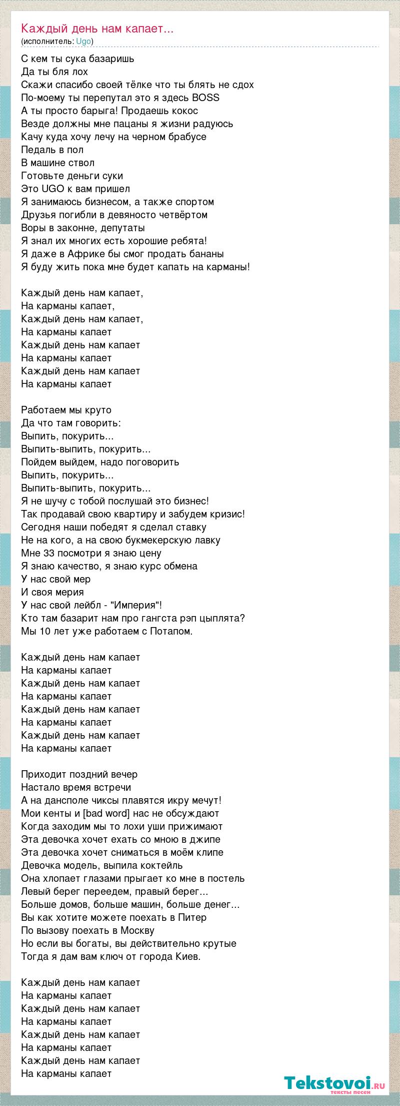 С кем ты сука базаришь Да ты бля лох Скажи спасибо своей тёлке что ты блять не сдох По-моему ты перепутал это я здесь BOSS А ты просто барыга! Продаешь кокос Везде должны мне пацаны я жизни радуюсь Качу куда хочу лечу на черном брабусе Педаль в пол В машине ствол Готовьте деньги суки Это UGO к вам пришел Я занимаюсь бизнесом, а также спортом Друзья погибли в девяносто четвёртом Воры в законне, депутаты Я знал их многих есть хорошие ребята! Я даже в Африке бы смог продать бананы Я буду жить пока мне будет капать на карманы! Каждый день нам капает, На карманы капает, Каждый день нам капает, На карманы капает Каждый день нам капает На карманы капает Каждый день нам капает На карманы капает Работаем мы круто Да что там говорить: Выпить, покурить... Выпить-выпить, покурить... Пойдем выйдем, надо поговорить Выпить, покурить... Выпить-выпить, покурить... Я не шучу с тобой послушай это бизнес! Так продавай свою квартиру и забудем кризис! Сегодня наши победят я сделал ставку Не на кого, а на свою букмекерскую лавку Мне 33 посмотри я знаю цену Я знаю качество, я знаю курс обмена У нас свой мер И своя мерия У нас свой лейбл - "Империя"! Кто там базарит нам про гангста рэп цыплята? Мы 10 лет уже работаем с Потапом. Каждый день нам капает На карманы капает Каждый день нам капает На карманы капает Каждый день нам капает На карманы капает Каждый день нам капает На карманы капает Приходит поздний вечер Настало время встречи А на дансполе чиксы плавятся икру мечут! Мои кенты и [bad word] нас не обсуждают Когда заходим мы то лохи уши прижимают Эта девочка хочет ехать со мною в джипе Эта девочка хочет сниматься в моём клипе Девочка модель, выпила коктейль Она хлопает глазами прыгает ко мне в постель Левый берег переедем, правый берег... Больше домов, больше машин, больше денег... Вы как хотите можете поехать в Питер По вызову поехать в Москву Но если вы богаты, вы действительно крутые Тогда я дам вам ключ от города Киев. Каждый день нам капает На карманы капает Каждый день нам капает На карманы капает Каждый день нам капает На карманы капает Каждый день нам капает На карманы капает