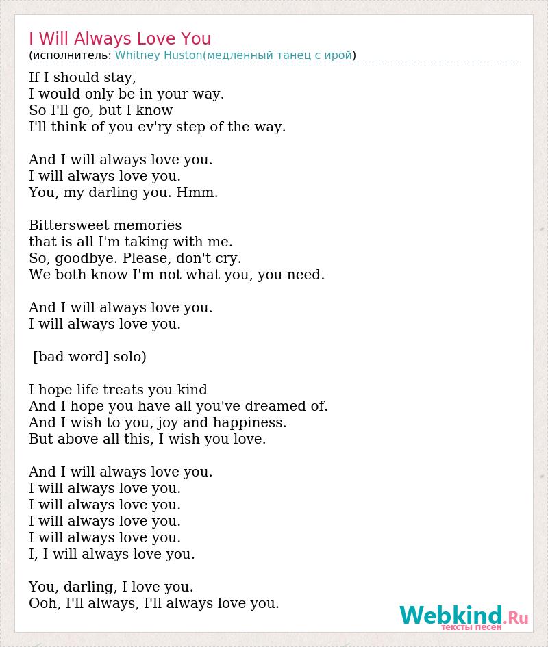 If I should stay, I would only be in your way. So I'll go, but I know I'll think of you ev'ry step of the way. And I will always love you. I will always love you. You, my darling you. Hmm. Bittersweet memories that is all I'm taking with me. So, goodbye. Please, don't cry. We both know I'm not what you, you need. And I will always love you. I will always love you. [bad word] solo) I hope life treats you kind And I hope you have all you've dreamed of. And I wish to you, joy and happiness. But above all this, I wish you love. And I will always love you. I will always love you. I will always love you. I will always love you. I will always love you. I, I will always love you. You, darling, I love you. Ooh, I'll always, I'll always love you.