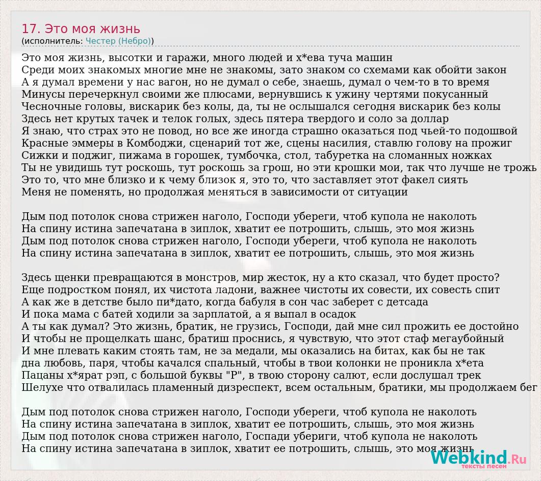 Это моя жизнь, высотки и гаражи, много людей и х*ева туча машин Среди моих знакомых многие мне не знакомы, зато знаком со схемами как обойти закон А я думал времени у нас вагон, но не думал о себе, знаешь, думал о чем-то в то время Минусы перечеркнул своими же плюсами, вернувшись к ужину чертями покусанный Чесночные головы, вискарик без колы, да, ты не ослышался сегодня вискарик без колы Здесь нет крутых тачек и телок голых, здесь пятера твердого и соло за доллар Я знаю, что страх это не повод, но все же иногда страшно оказаться под чьей-то подошвой Красные эммеры в Комбоджи, сценарий тот же, сцены насилия, ставлю голову на прожиг Сижки и поджиг, пижама в горошек, тумбочка, стол, табуретка на сломанных ножках Ты не увидишь тут роскошь, тут роскошь за грош, но эти крошки мои, так что лучше не трожь Это то, что мне близко и к чему близок я, это то, что заставляет этот факел сиять Меня не поменять, но продолжая меняться в зависимости от ситуации Дым под потолок снова стрижен наголо, Господи убереги, чтоб купола не наколоть На спину истина запечатана в зиплок, хватит ее потрошить, слышь, это моя жизнь Дым под потолок снова стрижен наголо, Господи убереги, чтоб купола не наколоть На спину истина запечатана в зиплок, хватит ее потрошить, слышь, это моя жизнь Здесь щенки превращаются в монстров, мир жесток, ну а кто сказал, что будет просто? Еще подростком понял, их чистота ладони, важнее чистоты их совести, их совесть спит А как же в детстве было пи*дато, когда бабуля в сон час заберет с детсада И пока мама с батей ходили за зарплатой, а я выпал в осадок А ты как думал? Это жизнь, братик, не грузись, Господи, дай мне сил прожить ее достойно И чтобы не прощелкать шанс, братиш проснись, я чувствую, что этот стаф мегаубойный И мне плевать каким стоять там, не за медали, мы оказались на битах, как бы не так дна любовь, паря, чтобы качался спальный, чтобы в твои колонки не проникла х*ета Пацаны х*ярат рэп, с большой буквы "Р", в твою сторону салют, если дослушал трек Шелухе что отвалилась пламенный дизреспект, всем остальным, братики, мы продолжаем бег Дым под потолок снова стрижен наголо, Господи убереги, чтоб купола не наколоть На спину истина запечатана в зиплок, хватит ее потрошить, слышь, это моя жизнь Дым под потолок снова стрижен наголо, Госпади убериги, чтоб купола не наколоть На спину истина запечатана в зиплок, хватит ее потрошить, слышь, это моя жизнь