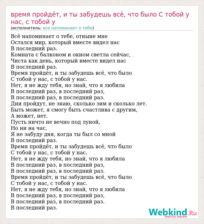 Главная→Исполнители→Все напоминает о тебе→Время пройдёт, и ты забудешь всё, что было С тобой у нас, с тобой у