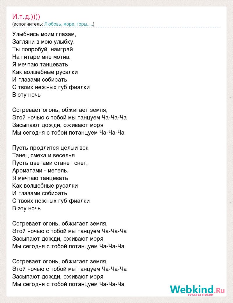 Улыбнись моим глазам, Загляни в мою улыбку. Ты попробуй, наиграй На гитаре мне мотив. Я мечтаю танцевать Как волшебные русалки И глазами собирать С твоих нежных губ фиалки В эту ночь Согревает огонь, обжигает земля, Этой ночью с тобой мы танцуем Ча-Ча-Ча Засыпают дожди, оживают моря Мы сегодня с тобой потанцуем Ча-Ча-Ча Пусть продлится целый век Танец смеха и веселья Пусть цветами станет снег, Ароматами - метель. Я мечтаю танцевать Как волшебные русалки И глазами собирать С твоих нежных губ фиалки В эту ночь Согревает огонь, обжигает земля, Этой ночью с тобой мы танцуем Ча-Ча-Ча Засыпают дожди, оживают моря Мы сегодня с тобой потанцуем Ча-Ча-Ча Согревает огонь, обжигает земля, Этой ночью с тобой мы танцуем Ча-Ча-Ча Засыпают дожди, оживают моря Мы сегодня с тобой потанцуем Ча-Ча-Ча