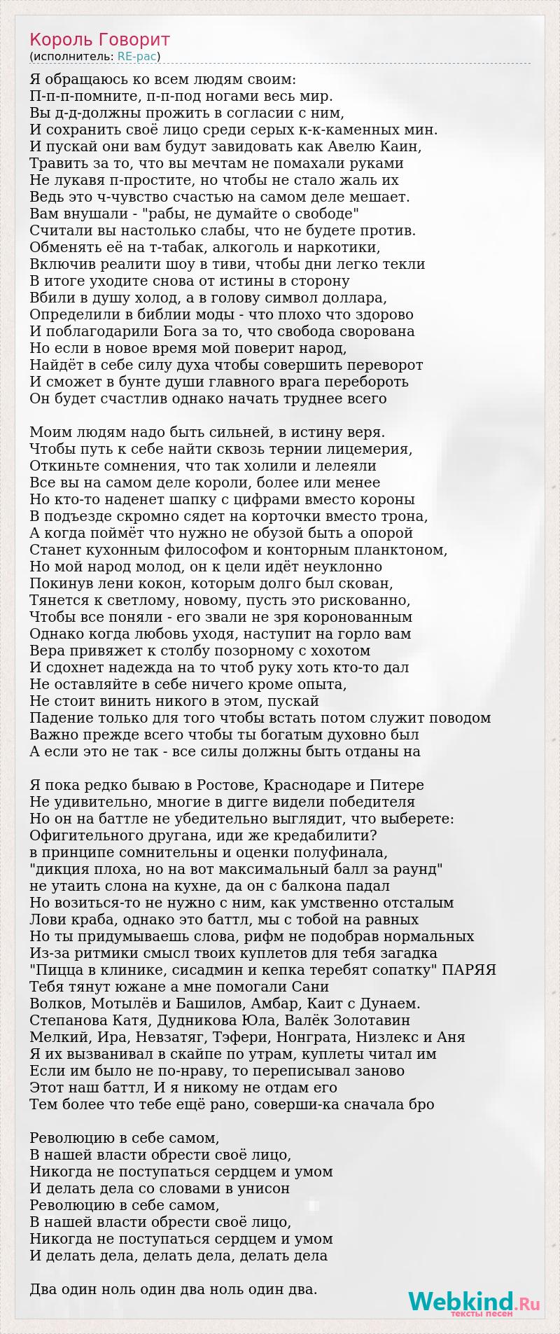 Я обращаюсь ко всем людям своим: П-п-п-помните, п-п-под ногами весь мир. Вы д-д-должны прожить в согласии с ним, И сохранить своё лицо среди серых к-к-каменных мин. И пускай они вам будут завидовать как Авелю Каин, Травить за то, что вы мечтам не помахали руками Не лукавя п-простите, но чтобы не стало жаль их Ведь это ч-чувство счастью на самом деле мешает. Вам внушали - "рабы, не думайте о свободе" Считали вы настолько слабы, что не будете против. Обменять её на т-табак, алкоголь и наркотики, Включив реалити шоу в тиви, чтобы дни легко текли В итоге уходите снова от истины в сторону Вбили в душу холод, а в голову символ доллара, Определили в библии моды - что плохо что здорово И поблагодарили Бога за то, что свобода сворована Но если в новое время мой поверит народ, Найдёт в себе силу духа чтобы совершить переворот И сможет в бунте души главного врага перебороть Он будет счастлив однако начать труднее всего Моим людям надо быть сильней, в истину веря. Чтобы путь к себе найти сквозь тернии лицемерия, Откиньте сомнения, что так холили и лелеяли Все вы на самом деле короли, более или менее Но кто-то наденет шапку с цифрами вместо короны В подъезде скромно сядет на корточки вместо трона, А когда поймёт что нужно не обузой быть а опорой Станет кухонным философом и конторным планктоном, Но мой народ молод, он к цели идёт неуклонно Покинув лени кокон, которым долго был скован, Тянется к светлому, новому, пусть это рискованно, Чтобы все поняли - его звали не зря коронованным Однако когда любовь уходя, наступит на горло вам Вера привяжет к столбу позорному с хохотом И сдохнет надежда на то чтоб руку хоть кто-то дал Не оставляйте в себе ничего кроме опыта, Не стоит винить никого в этом, пускай Падение только для того чтобы встать потом служит поводом Важно прежде всего чтобы ты богатым духовно был А если это не так - все силы должны быть отданы на Я пока редко бываю в Ростове, Краснодаре и Питере Не удивительно, многие в дигге видели победителя Но он на баттле не убедительно выглядит, что выберете: Офигительного другана, иди же кредабилити? в принципе сомнительны и оценки полуфинала, "дикция плоха, но на вот максимальный балл за раунд" не утаить слона на кухне, да он с балкона падал Но возиться-то не нужно с ним, как умственно отсталым Лови краба, однако это баттл, мы с тобой на равных Но ты придумываешь слова, рифм не подобрав нормальных Из-за ритмики смысл твоих куплетов для тебя загадка "Пицца в клинике, сисадмин и кепка теребят сопатку" ПАРЯЯ Тебя тянут южане а мне помогали Сани Волков, Мотылёв и Башилов, Амбар, Каит с Дунаем. Степанова Катя, Дудникова Юла, Валёк Золотавин Мелкий, Ира, Невзатяг, Тэфери, Нонграта, Низлекс и Аня Я их вызванивал в скайпе по утрам, куплеты читал им Если им было не по-нраву, то переписывал заново Этот наш баттл, И я никому не отдам его Тем более что тебе ещё рано, соверши-ка сначала бро Революцию в себе самом, В нашей власти обрести своё лицо, Никогда не поступаться сердцем и умом И делать дела со словами в унисон Революцию в себе самом, В нашей власти обрести своё лицо, Никогда не поступаться сердцем и умом И делать дела, делать дела, делать дела Два один ноль один два ноль один два.