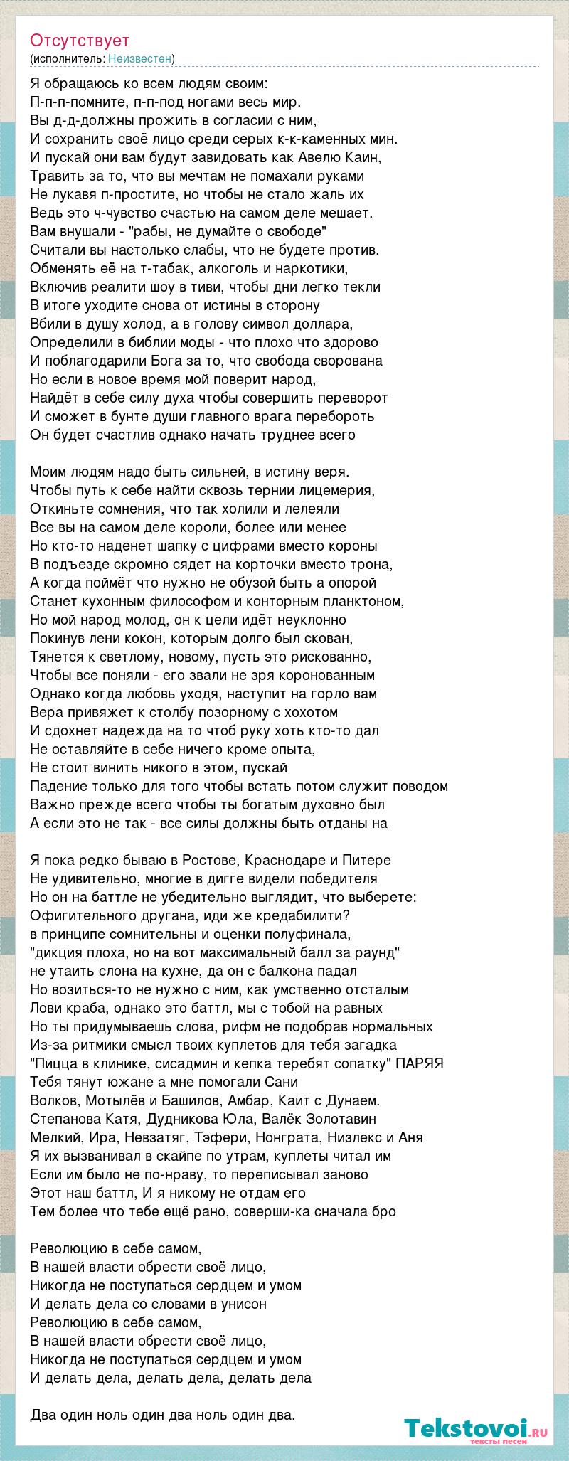 Я обращаюсь ко всем людям своим: П-п-п-помните, п-п-под ногами весь мир. Вы д-д-должны прожить в согласии с ним, И сохранить своё лицо среди серых к-к-каменных мин. И пускай они вам будут завидовать как Авелю Каин, Травить за то, что вы мечтам не помахали руками Не лукавя п-простите, но чтобы не стало жаль их Ведь это ч-чувство счастью на самом деле мешает. Вам внушали - "рабы, не думайте о свободе" Считали вы настолько слабы, что не будете против. Обменять её на т-табак, алкоголь и наркотики, Включив реалити шоу в тиви, чтобы дни легко текли В итоге уходите снова от истины в сторону Вбили в душу холод, а в голову символ доллара, Определили в библии моды - что плохо что здорово И поблагодарили Бога за то, что свобода сворована Но если в новое время мой поверит народ, Найдёт в себе силу духа чтобы совершить переворот И сможет в бунте души главного врага перебороть Он будет счастлив однако начать труднее всего Моим людям надо быть сильней, в истину веря. Чтобы путь к себе найти сквозь тернии лицемерия, Откиньте сомнения, что так холили и лелеяли Все вы на самом деле короли, более или менее Но кто-то наденет шапку с цифрами вместо короны В подъезде скромно сядет на корточки вместо трона, А когда поймёт что нужно не обузой быть а опорой Станет кухонным философом и конторным планктоном, Но мой народ молод, он к цели идёт неуклонно Покинув лени кокон, которым долго был скован, Тянется к светлому, новому, пусть это рискованно, Чтобы все поняли - его звали не зря коронованным Однако когда любовь уходя, наступит на горло вам Вера привяжет к столбу позорному с хохотом И сдохнет надежда на то чтоб руку хоть кто-то дал Не оставляйте в себе ничего кроме опыта, Не стоит винить никого в этом, пускай Падение только для того чтобы встать потом служит поводом Важно прежде всего чтобы ты богатым духовно был А если это не так - все силы должны быть отданы на Я пока редко бываю в Ростове, Краснодаре и Питере Не удивительно, многие в дигге видели победителя Но он на баттле не убедительно выглядит, что выберете: Офигительного другана, иди же кредабилити? в принципе сомнительны и оценки полуфинала, "дикция плоха, но на вот максимальный балл за раунд" не утаить слона на кухне, да он с балкона падал Но возиться-то не нужно с ним, как умственно отсталым Лови краба, однако это баттл, мы с тобой на равных Но ты придумываешь слова, рифм не подобрав нормальных Из-за ритмики смысл твоих куплетов для тебя загадка "Пицца в клинике, сисадмин и кепка теребят сопатку" ПАРЯЯ Тебя тянут южане а мне помогали Сани Волков, Мотылёв и Башилов, Амбар, Каит с Дунаем. Степанова Катя, Дудникова Юла, Валёк Золотавин Мелкий, Ира, Невзатяг, Тэфери, Нонграта, Низлекс и Аня Я их вызванивал в скайпе по утрам, куплеты читал им Если им было не по-нраву, то переписывал заново Этот наш баттл, И я никому не отдам его Тем более что тебе ещё рано, соверши-ка сначала бро Революцию в себе самом, В нашей власти обрести своё лицо, Никогда не поступаться сердцем и умом И делать дела со словами в унисон Революцию в себе самом, В нашей власти обрести своё лицо, Никогда не поступаться сердцем и умом И делать дела, делать дела, делать дела Два один ноль один два ноль один два.