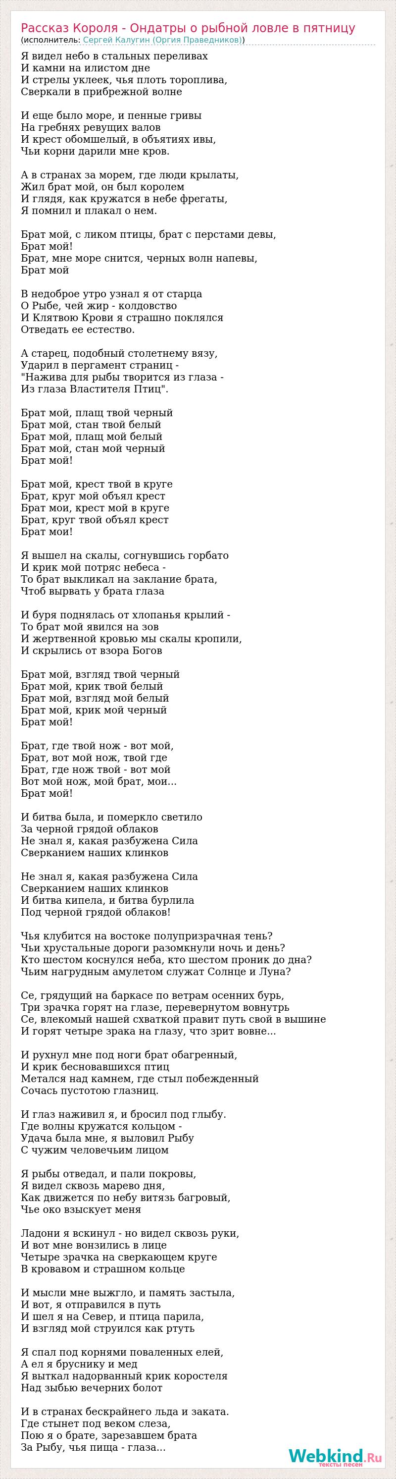 Я видел небо в стальных переливах И камни на илистом дне И стрелы уклеек, чья плоть тороплива, Сверкали в прибрежной волне И еще было море, и пенные гривы На гребнях ревущих валов И крест обомшелый, в объятиях ивы, Чьи корни дарили мне кров. А в странах за морем, где люди крылаты, Жил брат мой, он был королем И глядя, как кружатся в небе фрегаты, Я помнил и плакал о нем. Брат мой, с ликом птицы, брат с перстами девы, Брат мой! Брат, мне море снится, черных волн напевы, Брат мой В недоброе утро узнал я от старца О Рыбе, чей жир - колдовство И Клятвою Крови я страшно поклялся Отведать ее естество. А старец, подобный столетнему вязу, Ударил в пергамент страниц - "Нажива для рыбы творится из глаза - Из глаза Властителя Птиц". Брат мой, плащ твой черный Брат мой, стан твой белый Брат мой, плащ мой белый Брат мой, стан мой черный Брат мой! Брат мой, крест твой в круге Брат, круг мой объял крест Брат мои, крест мой в круге Брат, круг твой объял крест Брат мои! Я вышел на скалы, согнувшись горбато И крик мой потряс небеса - То брат выкликал на заклание брата, Чтоб вырвать у брата глаза И буря поднялась от хлопанья крылий - То брат мой явился на зов И жертвенной кровью мы скалы кропили, И скрылись от взора Богов Брат мой, взгляд твой черный Брат мой, крик твой белый Брат мой, взгляд мой белый Брат мой, крик мой черный Брат мой! Брат, где твой нож - вот мой, Брат, вот мой нож, твой где Брат, где нож твой - вот мой Вот мой нож, мой брат, мои... Брат мой! И битва была, и померкло светило За черной грядой облаков Не знал я, какая разбужена Сила Сверканием наших клинков Не знал я, какая разбужена Сила Сверканием наших клинков И битва кипела, и битва бурлила Под черной грядой облаков! Чья клубится на востоке полупризрачная тень? Чьи хрустальные дороги разомкнули ночь и день? Кто шестом коснулся неба, кто шестом проник до дна? Чьим нагрудным амулетом служат Солнце и Луна? Се, грядущий на баркасе по ветрам осенних бурь, Три зрачка горят на глазе, перевернутом вовнутрь Се, влекомый нашей схваткой правит путь свой в вышине И горят четыре зрака на глазу, что зрит вовне... И рухнул мне под ноги брат обагренный, И крик бесновавшихся птиц Метался над камнем, где стыл побежденный Сочась пустотою глазниц. И глаз наживил я, и бросил под глыбу. Где волны кружатся кольцом - Удача была мне, я выловил Рыбу С чужим человечьим лицом Я рыбы отведал, и пали покровы, Я видел сквозь марево дня, Как движется по небу витязь багровый, Чье око взыскует меня Ладони я вскинул - но видел сквозь руки, И вот мне вонзились в лице Четыре зрачка на сверкающем круге В кровавом и страшном кольце И мысли мне выжгло, и память застыла, И вот, я отправился в путь И шел я на Север, и птица парила, И взгляд мой струился как ртуть Я спал под корнями поваленных елей, А ел я бруснику и мед Я выткал надорванный крик коростеля Над зыбью вечерних болот И в странах бескрайнего льда и заката. Где стынет под веком слеза, Пою я о брате, зарезавшем брата За Рыбу, чья пища - глаза...
