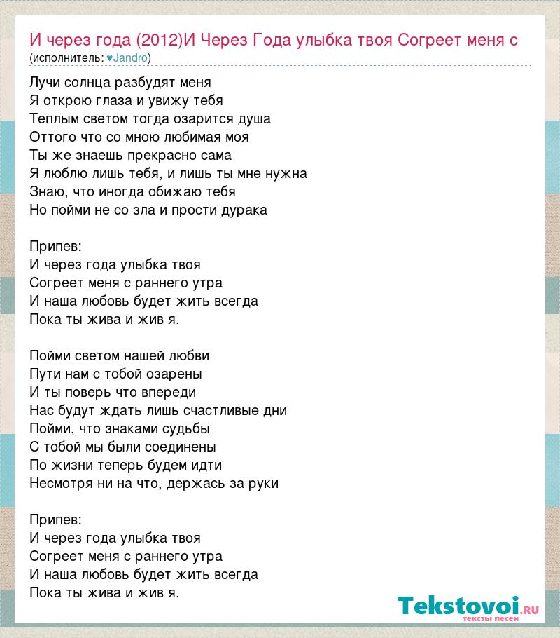 Лучи солнца разбудят меня Я открою глаза и увижу тебя Теплым светом тогда озарится душа Оттого что со мною любимая моя Ты же знаешь прекрасно сама Я люблю лишь тебя, и лишь ты мне нужна Знаю, что иногда обижаю тебя Но пойми не со зла и прости дурака Припев: И через года улыбка твоя Согреет меня с раннего утра И наша любовь будет жить всегда Пока ты жива и жив я. Пойми светом нашей любви Пути нам с тобой озарены И ты поверь что впереди Нас будут ждать лишь счастливые дни Пойми, что знаками судьбы С тобой мы были соединены По жизни теперь будем идти Несмотря ни на что, держась за руки Припев: И через года улыбка твоя Согреет меня с раннего утра И наша любовь будет жить всегда Пока ты жива и жив я.