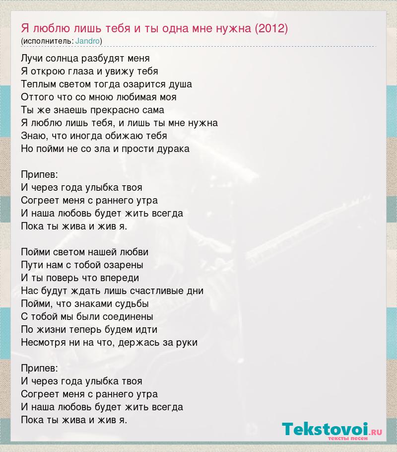 Лучи солнца разбудят меня Я открою глаза и увижу тебя Теплым светом тогда озарится душа Оттого что со мною любимая моя Ты же знаешь прекрасно сама Я люблю лишь тебя, и лишь ты мне нужна Знаю, что иногда обижаю тебя Но пойми не со зла и прости дурака Припев: И через года улыбка твоя Согреет меня с раннего утра И наша любовь будет жить всегда Пока ты жива и жив я. Пойми светом нашей любви Пути нам с тобой озарены И ты поверь что впереди Нас будут ждать лишь счастливые дни Пойми, что знаками судьбы С тобой мы были соединены По жизни теперь будем идти Несмотря ни на что, держась за руки Припев: И через года улыбка твоя Согреет меня с раннего утра И наша любовь будет жить всегда Пока ты жива и жив я.