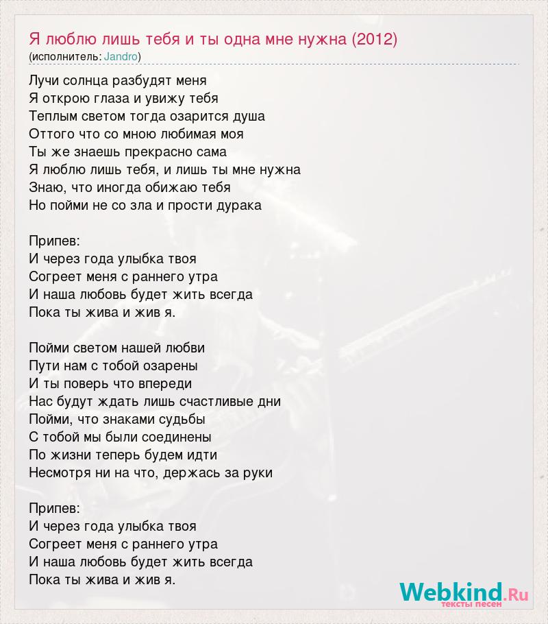 Лучи солнца разбудят меня Я открою глаза и увижу тебя Теплым светом тогда озарится душа Оттого что со мною любимая моя Ты же знаешь прекрасно сама Я люблю лишь тебя, и лишь ты мне нужна Знаю, что иногда обижаю тебя Но пойми не со зла и прости дурака Припев: И через года улыбка твоя Согреет меня с раннего утра И наша любовь будет жить всегда Пока ты жива и жив я. Пойми светом нашей любви Пути нам с тобой озарены И ты поверь что впереди Нас будут ждать лишь счастливые дни Пойми, что знаками судьбы С тобой мы были соединены По жизни теперь будем идти Несмотря ни на что, держась за руки Припев: И через года улыбка твоя Согреет меня с раннего утра И наша любовь будет жить всегда Пока ты жива и жив я.
