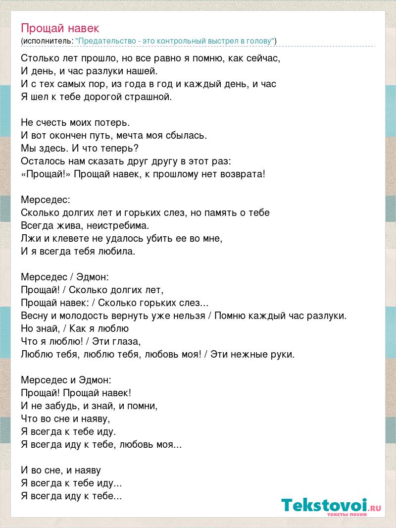 Столько лет прошло, но все равно я помню, как сейчас, И день, и час разлуки нашей. И с тех самых пор, из года в год и каждый день, и час Я шел к тебе дорогой страшной. Не счесть моих потерь. И вот окончен путь, мечта моя сбылась. Мы здесь. И что теперь? Осталось нам сказать друг другу в этот раз: «Прощай!» Прощай навек, к прошлому нет возврата! Мерседес: Сколько долгих лет и горьких слез, но память о тебе Всегда жива, неистребима. Лжи и клевете не удалось убить ее во мне, И я всегда тебя любила. Мерседес / Эдмон: Прощай! / Сколько долгих лет, Прощай навек: / Сколько горьких слез... Весну и молодость вернуть уже нельзя / Помню каждый час разлуки. Но знай, / Как я люблю Что я люблю! / Эти глаза, Люблю тебя, люблю тебя, любовь моя! / Эти нежные руки. Мерседес и Эдмон: Прощай! Прощай навек! И не забудь, и знай, и помни, Что во сне и наяву, Я всегда к тебе иду. Я всегда иду к тебе, любовь моя... И во сне, и наяву Я всегда к тебе иду... Я всегда иду к тебе...