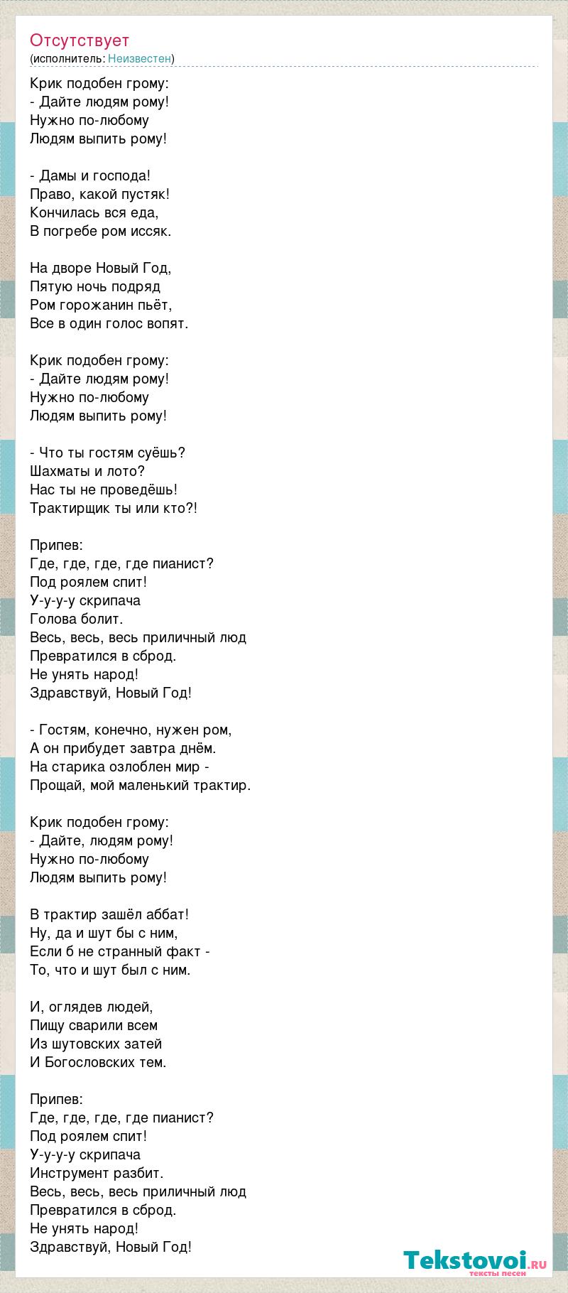 Крик подобен грому: - Дайте людям рому! Нужно по-любому Людям выпить рому! - Дамы и господа! Право, какой пустяк! Кончилась вся еда, В погребе ром иссяк. На дворе Новый Год, Пятую ночь подряд Ром горожанин пьёт, Все в один голос вопят. Крик подобен грому: - Дайте людям рому! Нужно по-любому Людям выпить рому! - Что ты гостям суёшь? Шахматы и лото? Нас ты не проведёшь! Трактирщик ты или кто?! Припев: Где, где, где, где пианист? Под роялем спит! У-у-у-у скрипача Голова болит. Весь, весь, весь приличный люд Превратился в сброд. Не унять народ! Здравствуй, Новый Год! - Гостям, конечно, нужен ром, А он прибудет завтра днём. На старика озлоблен мир - Прощай, мой маленький трактир. Крик подобен грому: - Дайте, людям рому! Нужно по-любому Людям выпить рому! В трактир зашёл аббат! Ну, да и шут бы с ним, Если б не странный факт - То, что и шут был с ним. И, оглядев людей, Пищу сварили всем Из шутовских затей И Богословских тем. Припев: Где, где, где, где пианист? Под роялем спит! У-у-у-у скрипача Инструмент разбит. Весь, весь, весь приличный люд Превратился в сброд. Не унять народ! Здравствуй, Новый Год!