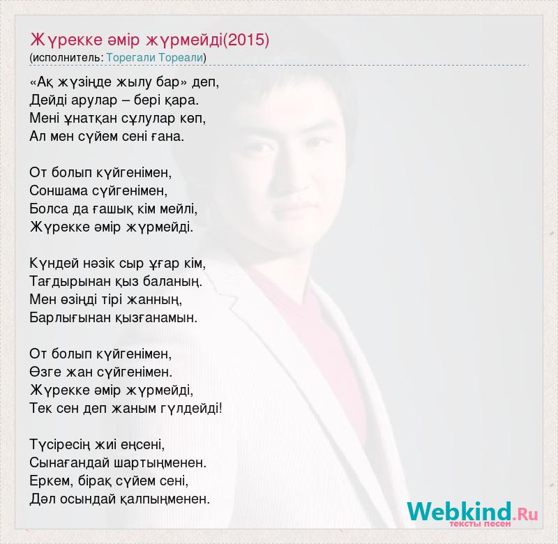 «Ақ жүзіңде жылу бар» деп, Дейді арулар – бері қара. Мені ұнатқан сұлулар көп, Ал мен сүйем сені ғана. От болып күйгенімен, Соншама сүйгенімен, Болса да ғашық кім мейлі, Жүрекке әмір жүрмейді. Күндей нәзік сыр ұғар кім, Тағдырынан қыз баланың. Мен өзіңді тірі жанның, Барлығынан қызғанамын. От болып күйгенімен, Өзге жан сүйгенімен. Жүрекке әмір жүрмейді, Тек сен деп жаным гүлдейді! Түсіресің жиі еңсені, Сынағандай шартыңменен. Еркем, бірақ сүйем сені, Дәл осындай қалпыңменен.