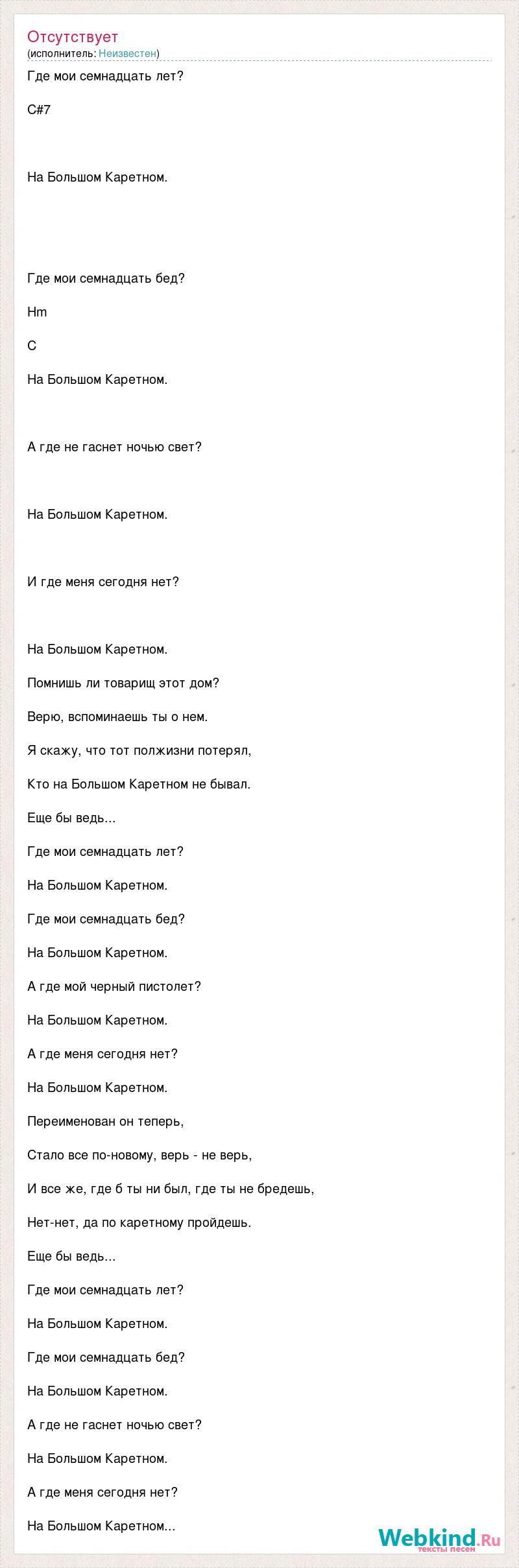 Где мои семнадцать лет? С#7 На Большом Каретном. Где мои семнадцать бед? Нm С На Большом Каретном. А где не гаснет ночью свет? На Большом Каретном. И где меня сегодня нет? На Большом Каретном. Помнишь ли товарищ этот дом? Верю, вспоминаешь ты о нем. Я скажу, что тот полжизни потерял, Кто на Большом Каретном не бывал. Еще бы ведь... Где мои семнадцать лет? На Большом Каретном. Где мои семнадцать бед? На Большом Каретном. А где мой черный пистолет? На Большом Каретном. А где меня сегодня нет? На Большом Каретном. Переименован он теперь, Стало все по-новому, верь - не верь, И все же, где б ты ни был, где ты не бредешь, Нет-нет, да по каретному пройдешь. Еще бы ведь... Где мои семнадцать лет? На Большом Каретном. Где мои семнадцать бед? На Большом Каретном. А где не гаснет ночью свет? На Большом Каретном. А где меня сегодня нет? На Большом Каретном...