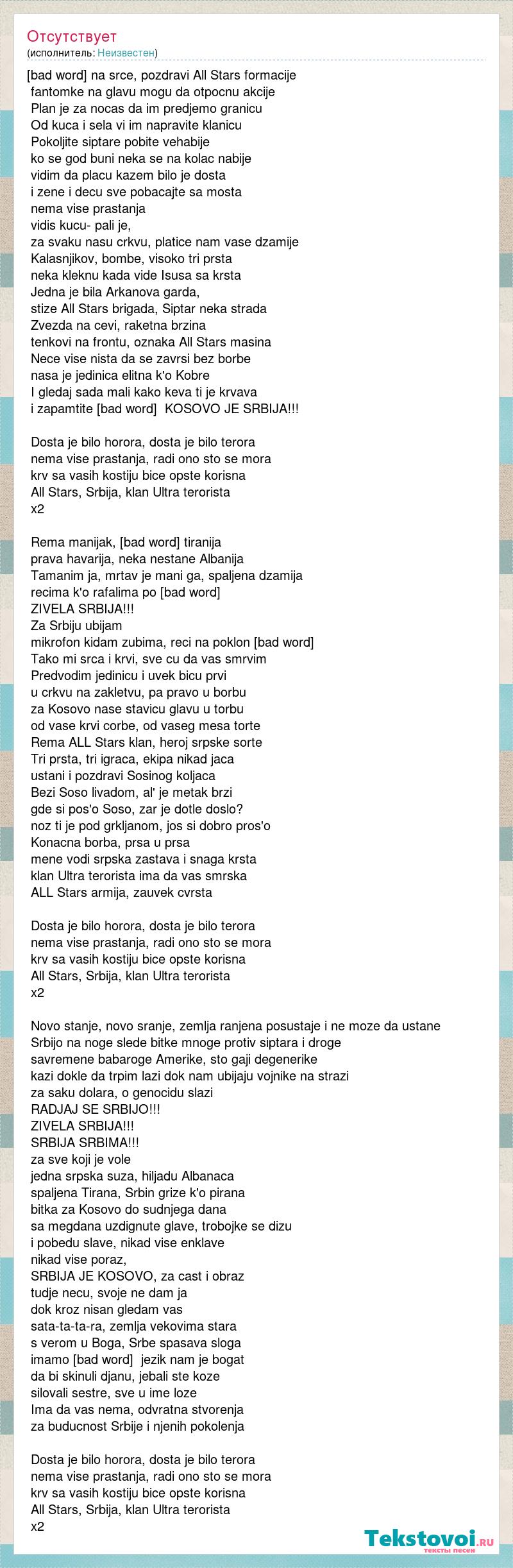 Ruke na srce, pozdravi All Stars formacije fantomke na glavu mogu da otpocnu akcije Plan je za nocas da im predjemo granicu Od kuca i sela vi im napravite klanicu Pokoljite siptare pobite vehabije ko se god buni neka se na kolac nabije vidim da placu kazem bilo je dosta i zene i decu sve pobacajte sa mosta nema vise prastanja vidis kucu- pali je, za svaku nasu crkvu, platice nam vase dzamije Kalasnjikov, bombe, visoko tri prsta neka kleknu kada vide Isusa sa krsta Jedna je bila Arkanova garda, stize All Stars brigada, Siptar neka strada Zvezda na cevi, raketna brzina tenkovi na frontu, oznaka All Stars masina Nece vise nista da se zavrsi bez borbe nasa je jedinica elitna k'o Kobre I gledaj sada mali kako keva ti je krvava i zapamtite poruku, KOSOVO JE SRBIJA!!! Dosta je bilo horora, dosta je bilo terora nema vise prastanja, radi ono sto se mora krv sa vasih kostiju bice opste korisna All Stars, Srbija, klan Ultra terorista x2 Rema manijak, brutalna tiranija prava havarija, neka nestane Albanija Tamanim ja, mrtav je mani ga, spaljena dzamija recima k'o rafalima po instrumentalima ZIVELA SRBIJA!!! Za Srbiju ubijam mikrofon kidam zubima, reci na poklon drugima Tako mi srca i krvi, sve cu da vas smrvim Predvodim jedinicu i uvek bicu prvi u crkvu na zakletvu, pa pravo u borbu za Kosovo nase stavicu glavu u torbu od vase krvi corbe, od vaseg mesa torte Rema ALL Stars klan, heroj srpske sorte Tri prsta, tri igraca, ekipa nikad jaca ustani i pozdravi Sosinog koljaca Bezi Soso livadom, al' je metak brzi gde si pos'o Soso, zar je dotle doslo? noz ti je pod grkljanom, jos si dobro pros'o Konacna borba, prsa u prsa mene vodi srpska zastava i snaga krsta klan Ultra terorista ima da vas smrska ALL Stars armija, zauvek cvrsta Dosta je bilo horora, dosta je bilo terora nema vise prastanja, radi ono sto se mora krv sa vasih kostiju bice opste korisna All Stars, Srbija, klan Ultra terorista x2 Novo stanje, novo sranje, zemlja ranjena posustaje i ne moze da ustane Srbijo na noge slede bitke mnoge protiv siptara i droge savremene babaroge Amerike, sto gaji degenerike kazi dokle da trpim lazi dok nam ubijaju vojnike na strazi za saku dolara, o genocidu slazi RADJAJ SE SRBIJO!!! ZIVELA SRBIJA!!! SRBIJA SRBIMA!!! za sve koji je vole jedna srpska suza, hiljadu Albanaca spaljena Tirana, Srbin grize k'o pirana bitka za Kosovo do sudnjega dana sa megdana uzdignute glave, trobojke se dizu i pobedu slave, nikad vise enklave nikad vise poraz, SRBIJA JE KOSOVO, za cast i obraz tudje necu, svoje ne dam ja dok kroz nisan gledam vas sata-ta-ta-ra, zemlja vekovima stara s verom u Boga, Srbe spasava sloga imamo kulturu, jezik nam je bogat da bi skinuli djanu, jebali ste koze silovali sestre, sve u ime loze Ima da vas nema, odvratna stvorenja za buducnost Srbije i njenih pokolenja Dosta je bilo horora, dosta je bilo terora nema vise prastanja, radi ono sto se mora krv sa vasih kostiju bice opste korisna All Stars, Srbija, klan Ultra terorista x2