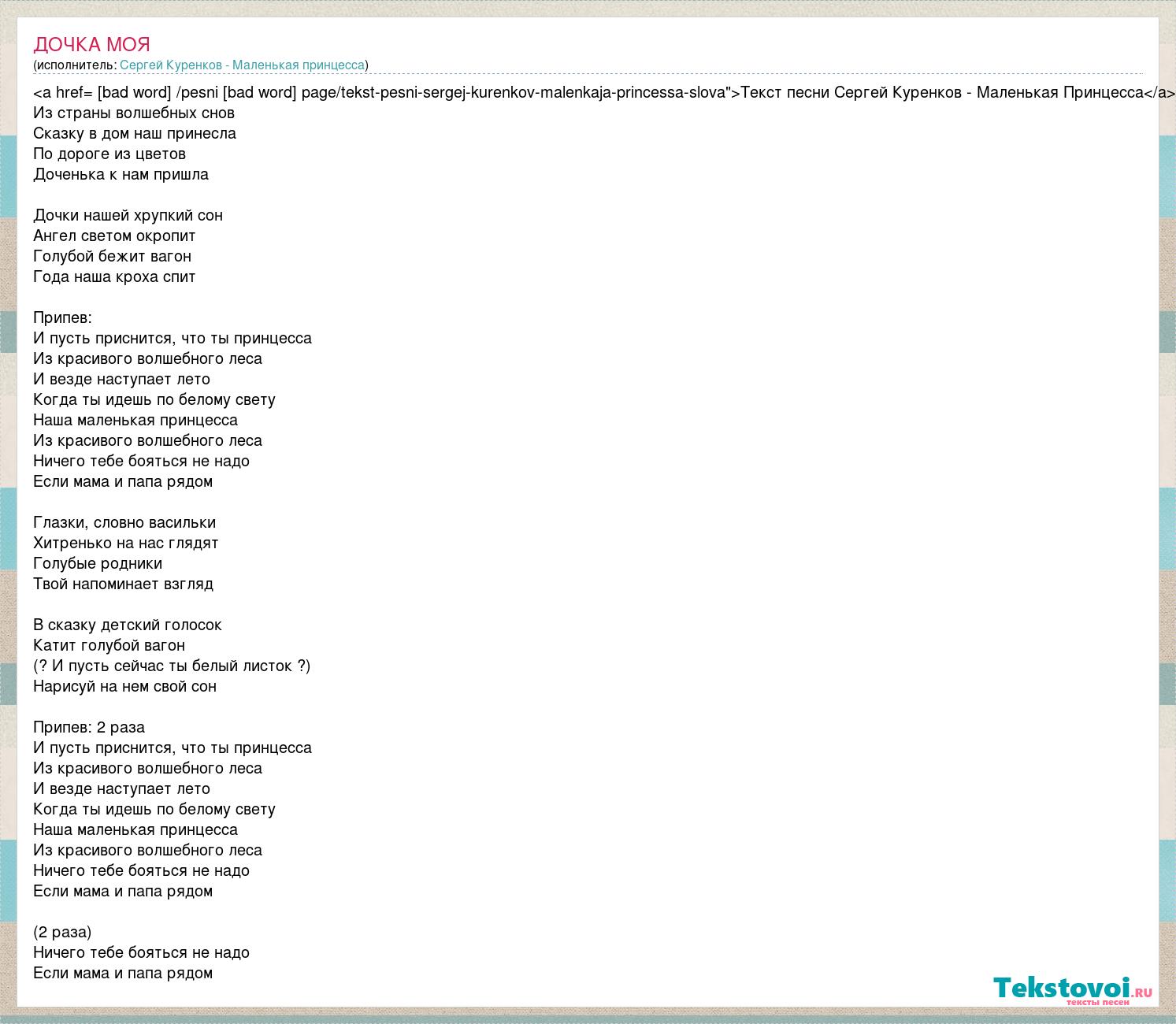 <a href= [bad word] /pesni [bad word] page/tekst-pesni-sergej-kurenkov-malenkaja-princessa-slova">Текст песни Сергей Куренков - Маленькая Принцесса</a> Из страны волшебных снов Сказку в дом наш принесла По дороге из цветов Доченька к нам пришла Дочки нашей хрупкий сон Ангел светом окропит Голубой бежит вагон Года наша кроха спит Припев: И пусть приснится, что ты принцесса Из красивого волшебного леса И везде наступает лето Когда ты идешь по белому свету Наша маленькая принцесса Из красивого волшебного леса Ничего тебе бояться не надо Если мама и папа рядом Глазки, словно васильки Хитренько на нас глядят Голубые родники Твой напоминает взгляд В сказку детский голосок Катит голубой вагон (? И пусть сейчас ты белый листок ?) Нарисуй на нем свой сон Припев: 2 раза И пусть приснится, что ты принцесса Из красивого волшебного леса И везде наступает лето Когда ты идешь по белому свету Наша маленькая принцесса Из красивого волшебного леса Ничего тебе бояться не надо Если мама и папа рядом (2 раза) Ничего тебе бояться не надо Если мама и папа рядом