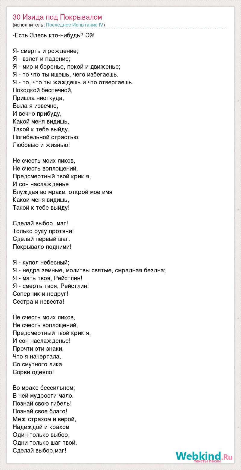-Есть Здесь кто-нибудь? Эй! Я- смерть и рождение; Я - взлет и падение; Я - мир и боренье, покой и движенье; Я - то что ты ищешь, чего избегаешь. Я - то, что ты жаждешь и что отвергаешь. Походкой беспечной, Пришла ниоткуда, Была я извечно, И вечно прибуду, Какой меня видишь, Такой к тебе выйду, Погибельной страстью, Любовью и жизнью! Не счесть моих ликов, Не счесть воплощений, Предсмертный твой крик я, И сон наслажденье Блуждая во мраке, открой мое имя Какой меня видишь, Такой к тебе выйду! Сделай выбор, маг! Только руку протяни! Сделай первый шаг. Покрывало подними! Я - купол небесный; Я - недра земные, молитвы святые, смрадная бездна; Я - мать твоя, Рейстлин! Я - смерть твоя, Рейстлин! Соперник и недруг! Сестра и невеста! Не счесть моих ликов, Не счесть воплощений, Предсмертный твой крик я, И сон наслажденье! Прочти эти знаки, Что я начертала, Со смутного лика Сорви одеяло! Во мраке бессильном; В ней мудрости мало. Познай свою гибель! Познай свое благо! Меж страхом и верой, Надеждой и крахом Один только выбор, Одни только шаг твой. Сделай выбор,маг!